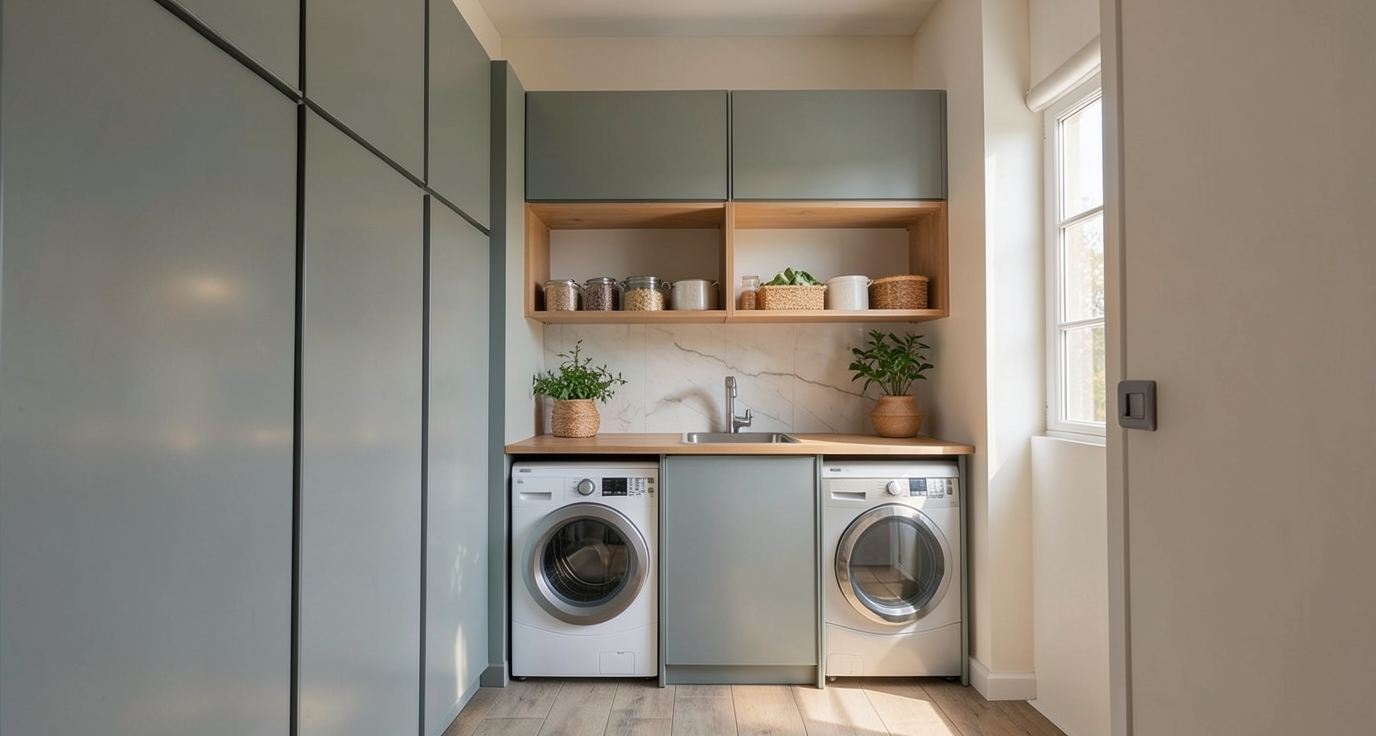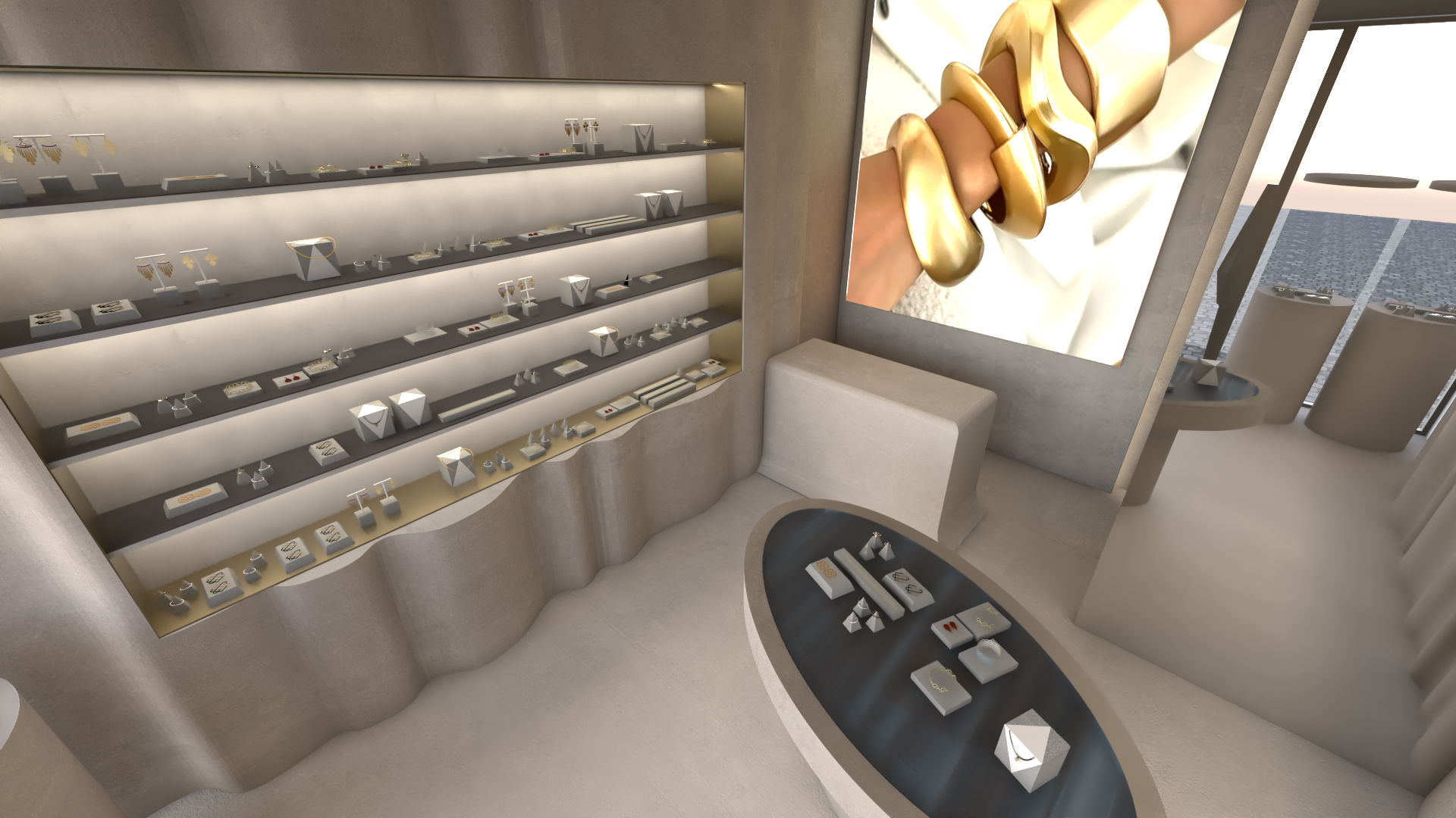 jewelry showroom interior luxurious modern design warm ambient lighting shelves filled with elegant gold and silver jewelry use soft beige and cream stucco tones for walls and floor accented by a large golden poster on the wall showcasing jewelry oval display table in the center with sleek grey velvet surface large windows bring natural light creating a serene atmosphere