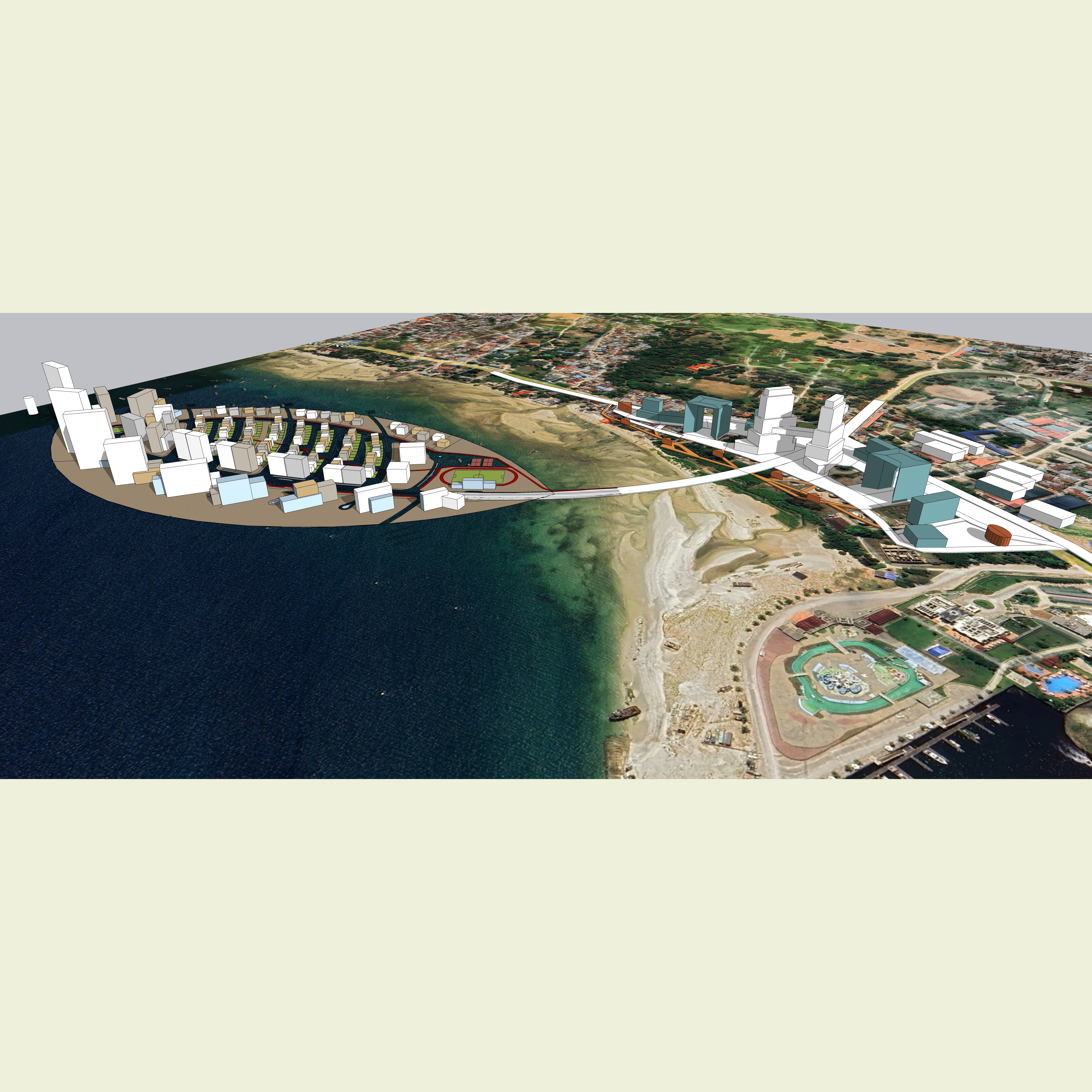 cinematic hyper realistic tropical island city keep the overall massing and layout but reinterpret it with modern tropical architecture with high rise hotels and office buildings add mixed use housing retail streets and sports facilities integrated into a lush coastal environment include dense tropical vegetation palms flowering trees coastal plants and layered greenery add detailed street furniture such as benches shading structures planters bike racks lighting and wayfinding populate the scene with diverse people walking shopping exercising and relaxing use warm natural light soft atmospheric haze and a high end filmic look architecture