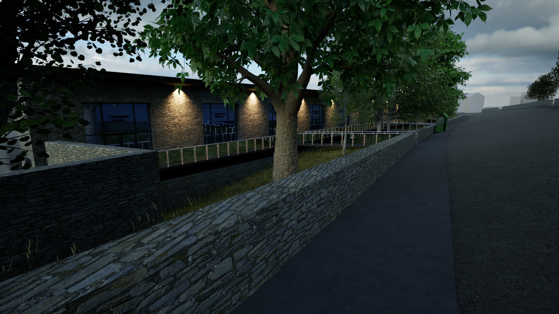 render a modern parking lot next to a sleek industrial style building the building is dark gray with subtle textures exuding a contemporary aesthetic the parking lot features vehicles in colors like deep blue silver and red adding vibrant contrast lush trees with rich green leaves line the background offering a natural setting the sky is partly cloudy casting soft shadows creating a serene early evening atmosphere use warm lighting on the parking lot reflecting off the wet pavement for a dynamic inviting feel