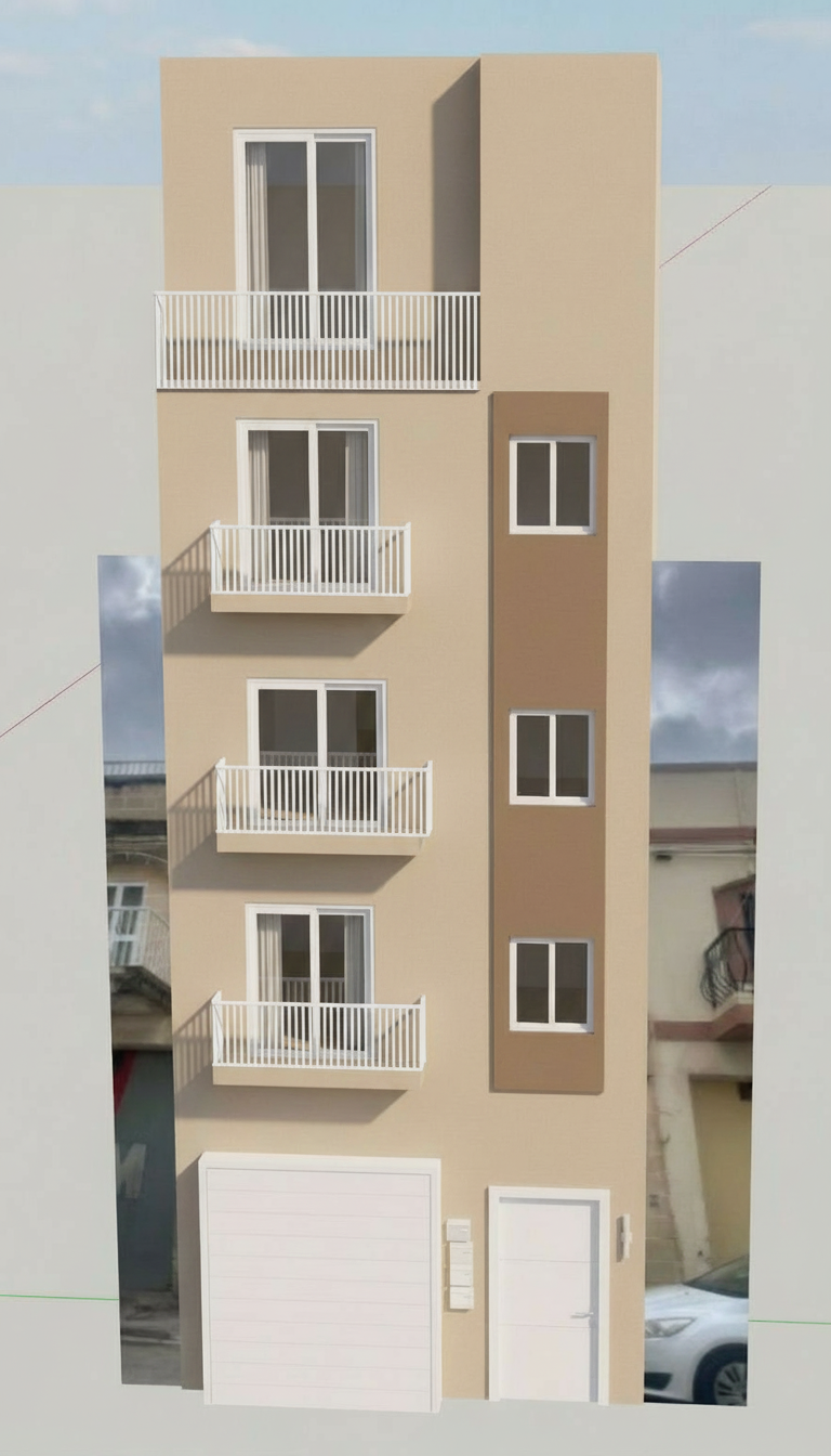 ultra realistic architectural render of the provided facade preserve the building exactly as shown same geometry proportions materials and colours same front elevation view no redesign of facade elements allow improvement of the surrounding environment only replace the plain background with a realistic urban street context integrate the building naturally between neighbouring buildings maintain a mediterranean streetscape similar to the original setting environment details realistic adjacent buildings on both sides pavement curb and street subtle parked cars soft natural sky lighting natural daylight consistent shadows across building and surroundings important constraints do not change the building design colours or materials do not change camera angle or perspective only enhance and rebuild the background environment rendering style high end photorealistic architectural visualization clean and realistic urban setting important treat the building as fixed only regenerate the surroundings
