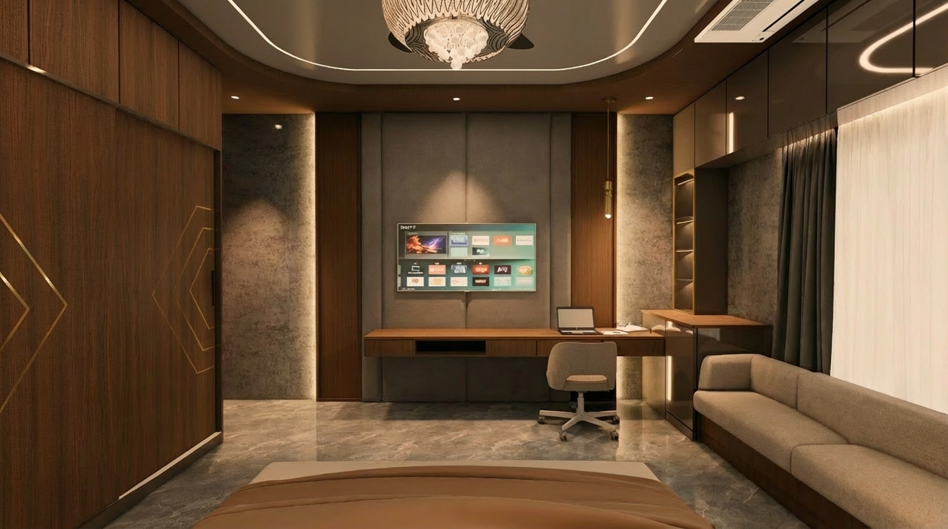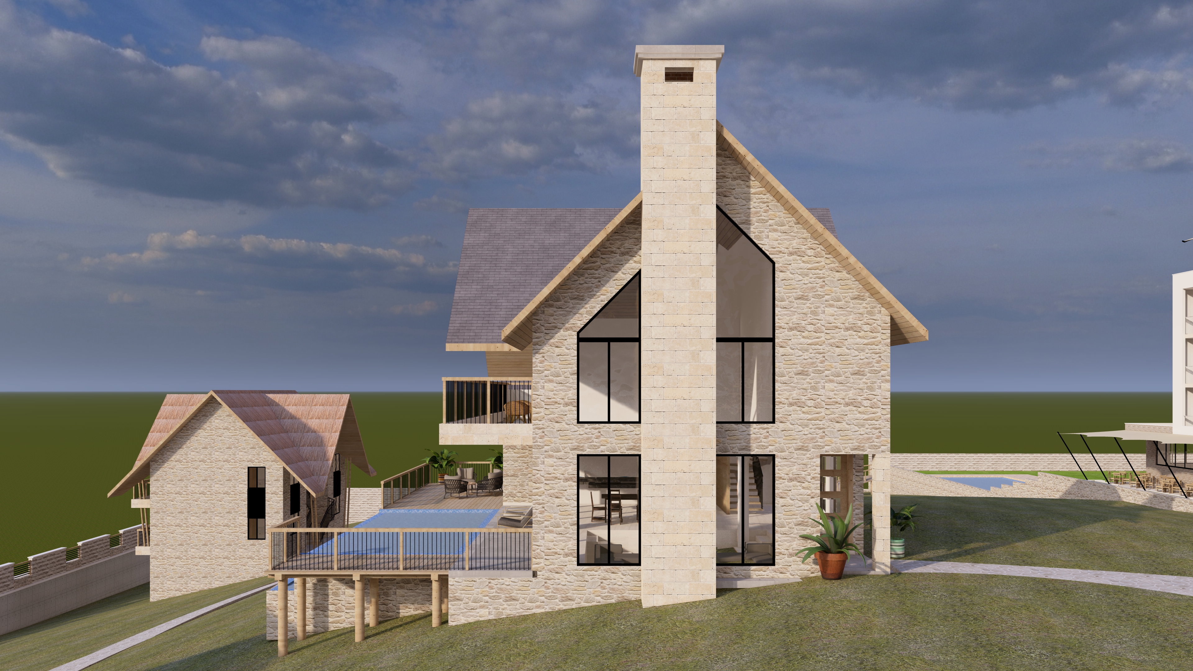 this is a model of a house add few trees in background for context add vegetation with some floral ones the pool that is on the model should be visible