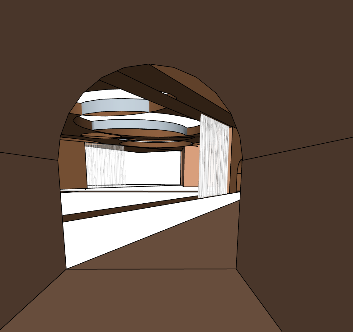 sustainable design exterior shot view from tunnel arched vault ona curtains and wooden pathway and corten steel and wood wall and roof with holes make it 100 accurate and no backround architecture