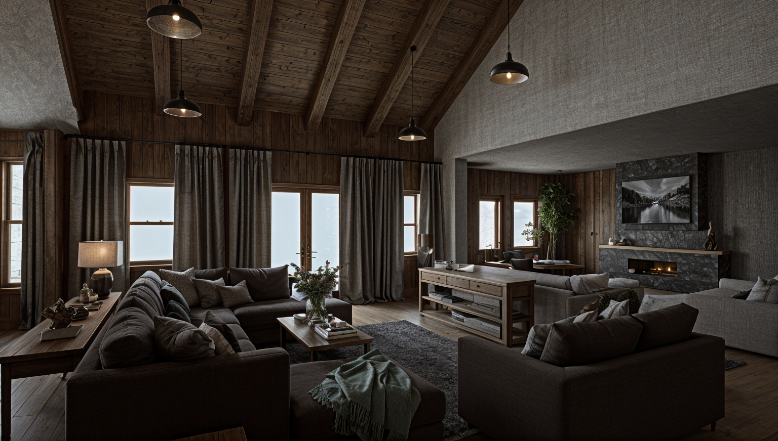 add sheer floor to ceiling curtains in warm ivory linen mounted at ceiling height and pulled fully open to frame the windows soft natural daylight fills the room creating an airy upscale hotel like atmosphere minimalist contemporary interior design high realism architectural photography style wide angle clean lines eight windowns only do not change design