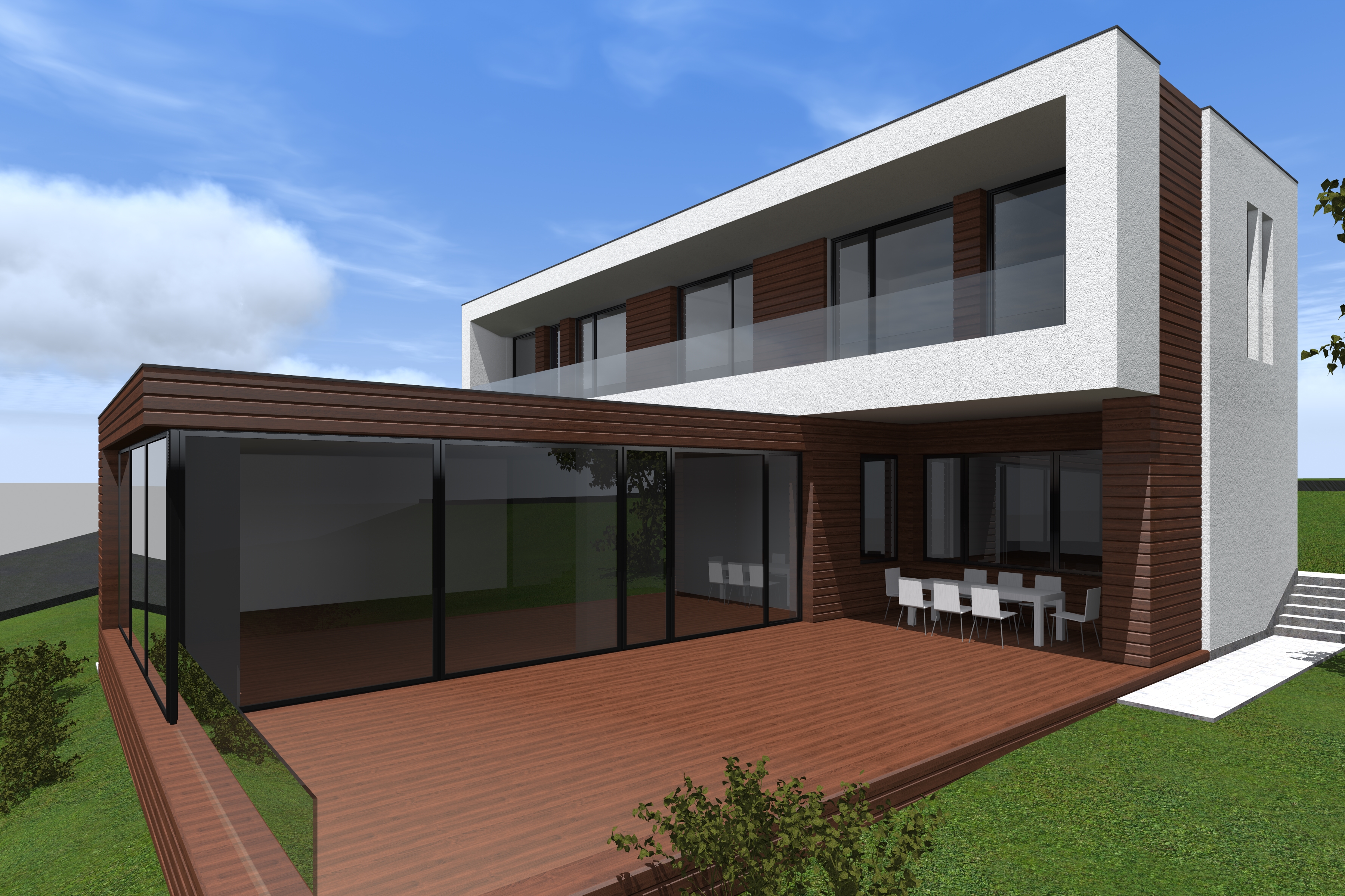 convert the image into a realistic outdoor photograph with professional architectural aesthetic maintaining 100 of the geometry and layout applying authentic materials afternoon warm lighting with soft shadows and a sharp photorealistic result add landscape design behind the building do not change material colors