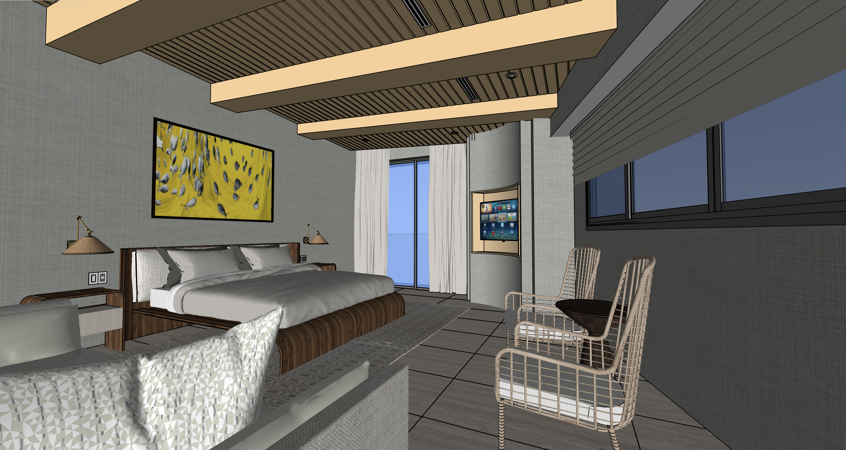 keep true to lightness and colors add light blue to back mural sky make sisal rug with lots of texture and some color