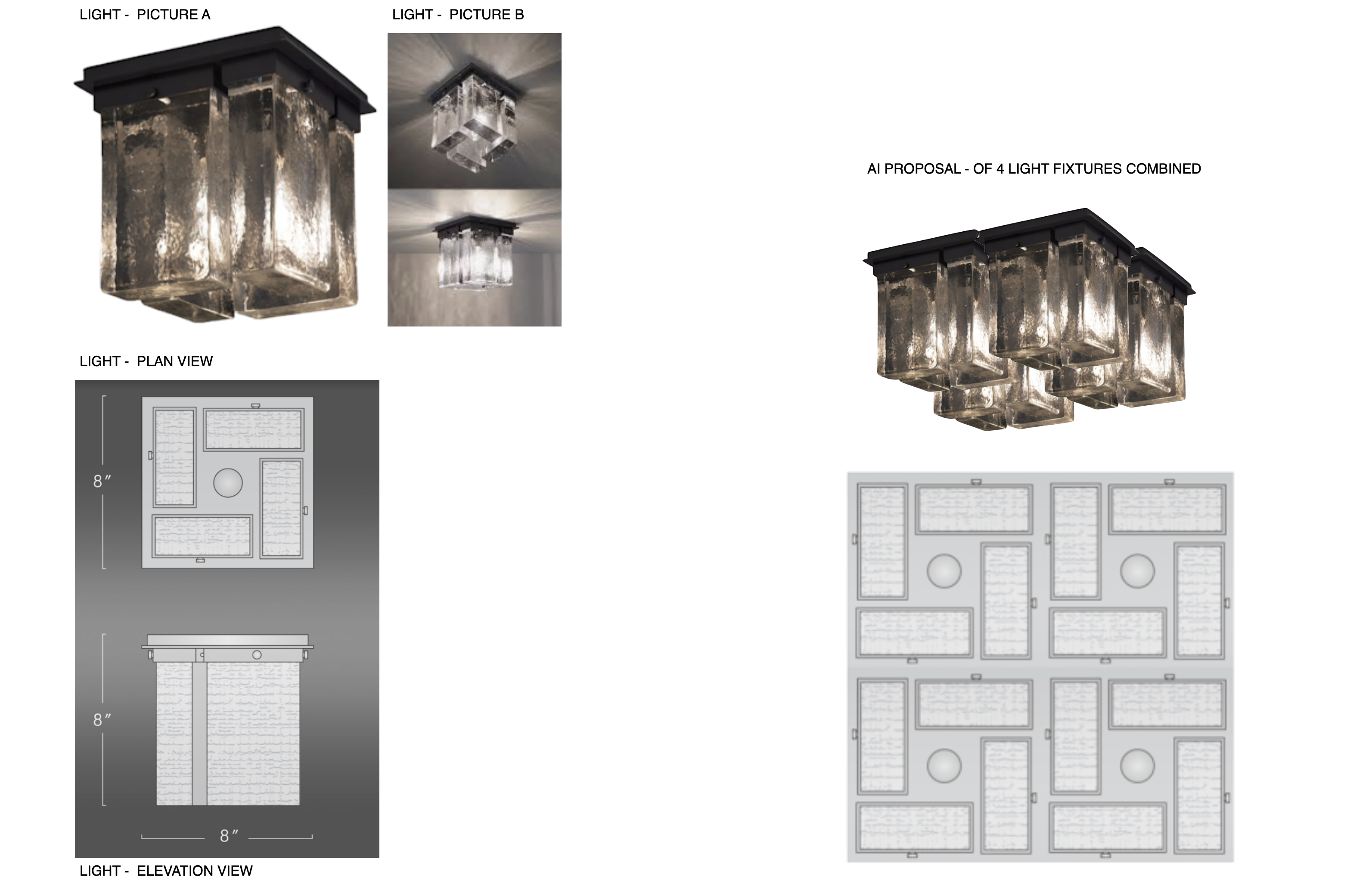 exterior shot please render an image of a light fixture similar to the picture angle on the ceilingin light picture b but referenceing the style and color of the light picture a duplicate the fixture 4 times to create one largeceiling light reference the proposed plan view