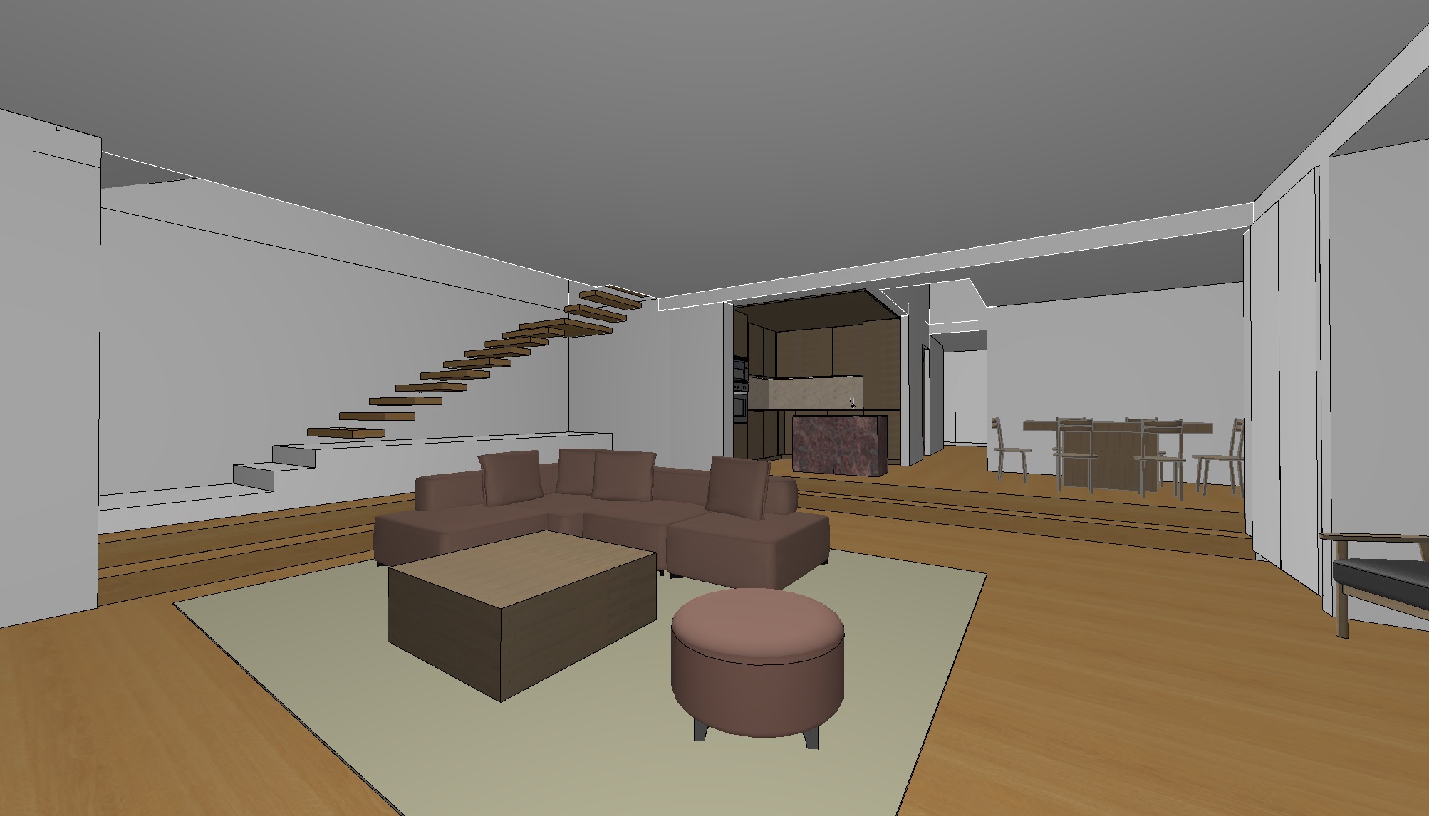 create a very realistic image with high precision of the original image do not change any of the elements in the image and don t add any other elements except for light fixtures create a relaxing and elegant living room the floor is natural oak the furniture elements are also natural oak those who are white keep them white and the island should be a touch of texture in a natural sfine stone like marble add plenty of natural light through the window and from the skylight above the stairs