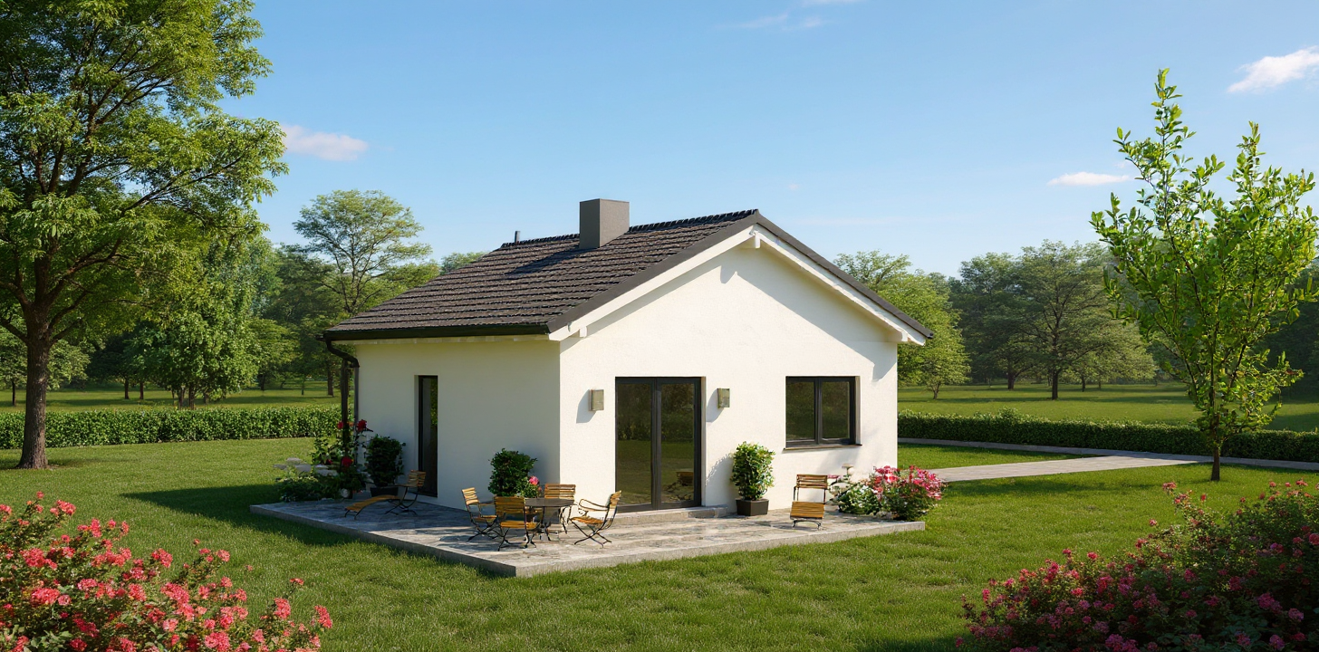 make a photorealistic rendering of the scene the building is surrounded by a green garden with a lot of trees grass and flowers the weather is sunny with a few clouds in the sky add a lot of people also in the water bushes trees and flowers keep everything else the same the time of dat is the golden hour