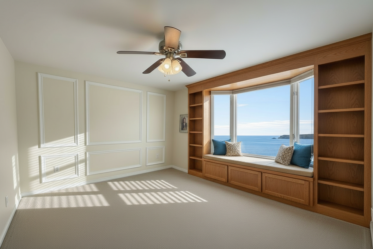 replace the window with the bay window in the reference photo it should only be as wide as the current window is