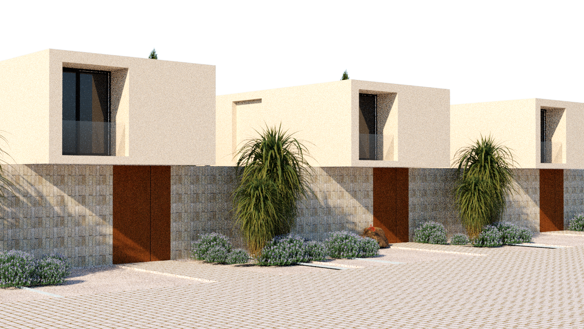 photorealistic exterior render strictly based on the original composition geometry proportions and camera unchanged add a clear sky and a soft mediterranean natural background with distant vegetation ground in light natural cobblestone paving with realistic joints and tonal variation garden areas in white gravel clean and naturally distributed wall cladding in rectangular clay pieces with warm earthy tones slightly irregular texture and subtle variation upper cubic volumes finished in beige stucco matte and softly textured enhance vegetation while preserving placement natural mediterranean species balanced greens no oversaturation poetic mediterranean atmosphere warm daylight soft shadows gentle contrast slight air haze hyperrealistic materials pbr correct roughness no plastic look editorial architectural style