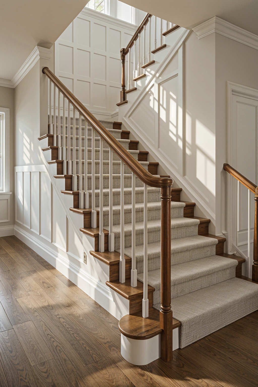 change the grid molding on stair landing to the board and batten style on lower left of photo
