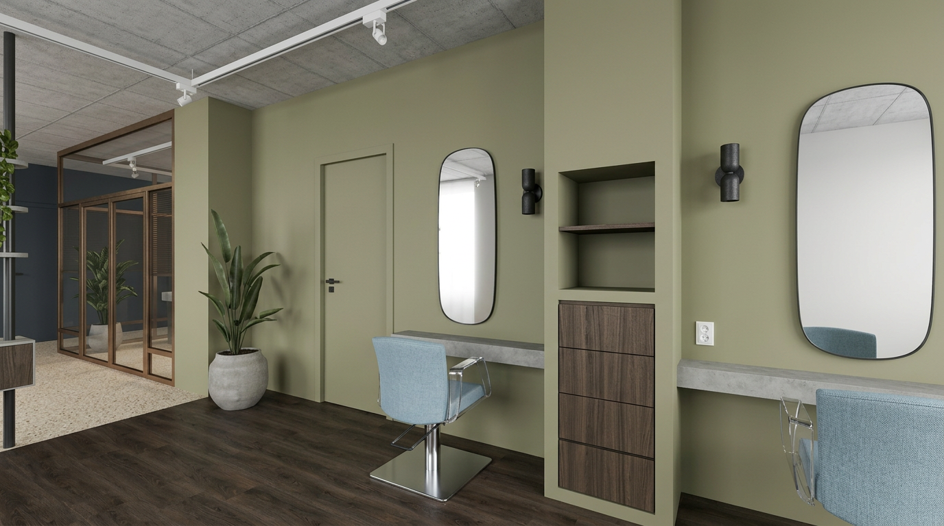 photorealistic architectural visualization of a high end hair salon interior the main wall and integrated cabinetry are finished in little greene portland stone deep 286 matte paint the cabinetry features open shelving in van pepijn pava lavasteen monza wood veneer styling stations feature floating ledges in light grey betoncire microcement the mirrors are organic soft rectangle shapes with matte black wall mounted sconces beside them the professional styling chairs are upholstered in verotex barbuda pro 24 fabric with clear transparent plexiglass armrests and a brushed metal base flooring the foreground features therdex c15055 rustique dark wood look pvc flooring transitioning in the background to a beige fine grain terrazzo floor details a large glass partition on the left with bronze anodized aluminum frames the wall visible behind the partition is painted in little greene attic ii 144 the ceiling has a light concrete look texture with a white track lighting system and white spotlights vertical structural poles are matte black all electrical outlets are clean white lighting style neutral even studio lighting without dramatic sunbeams or high contrast shadows hyper realistic textures 8k resolution highly detailed materials soft natural ambient occlusion interior design photography style