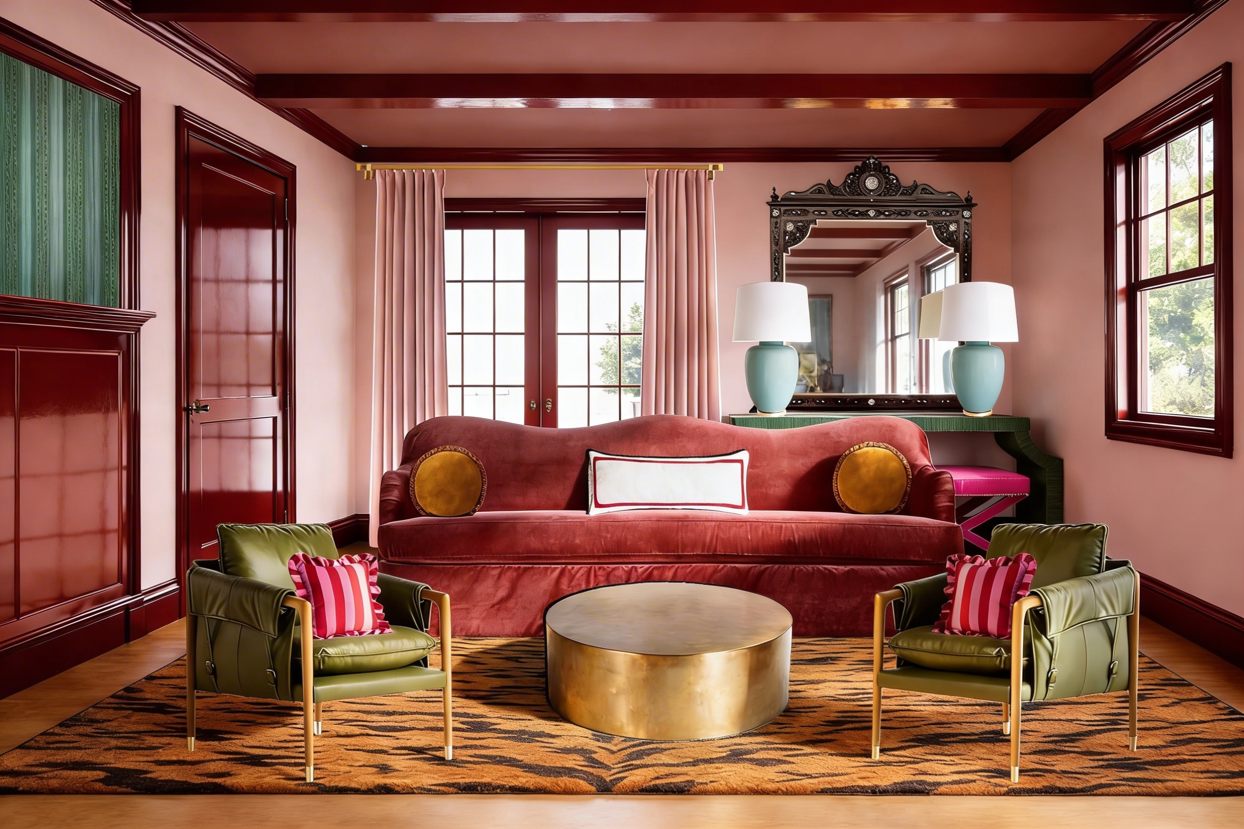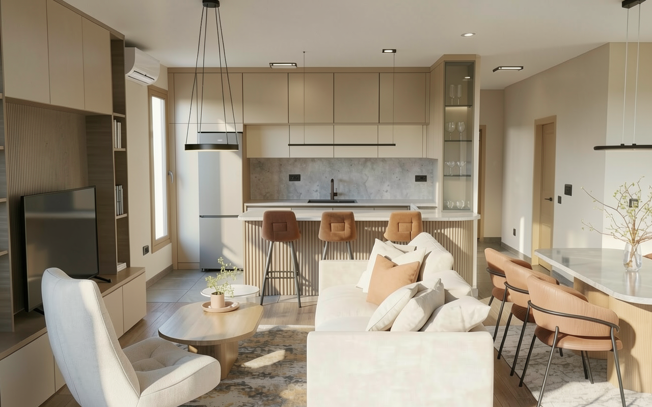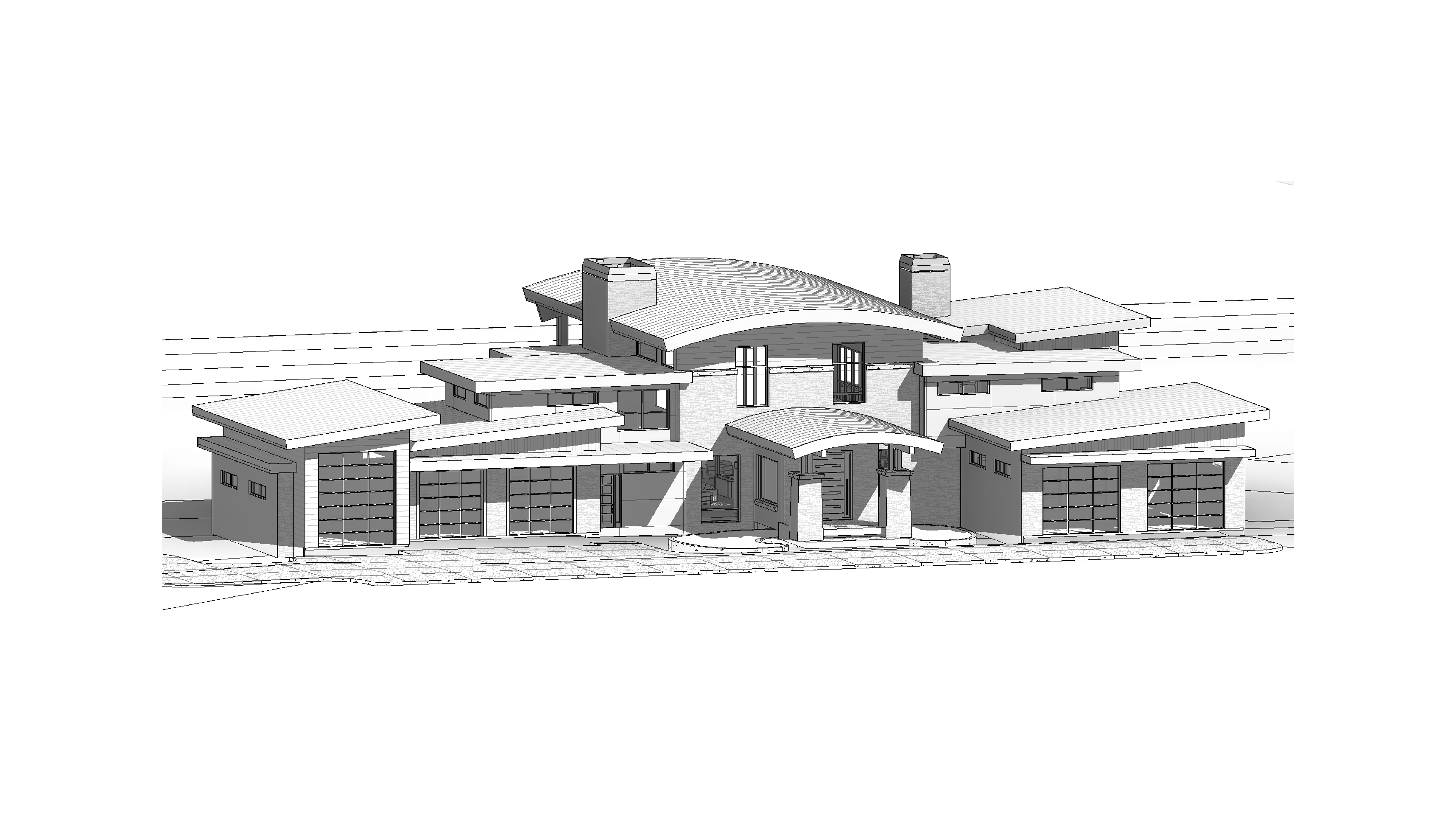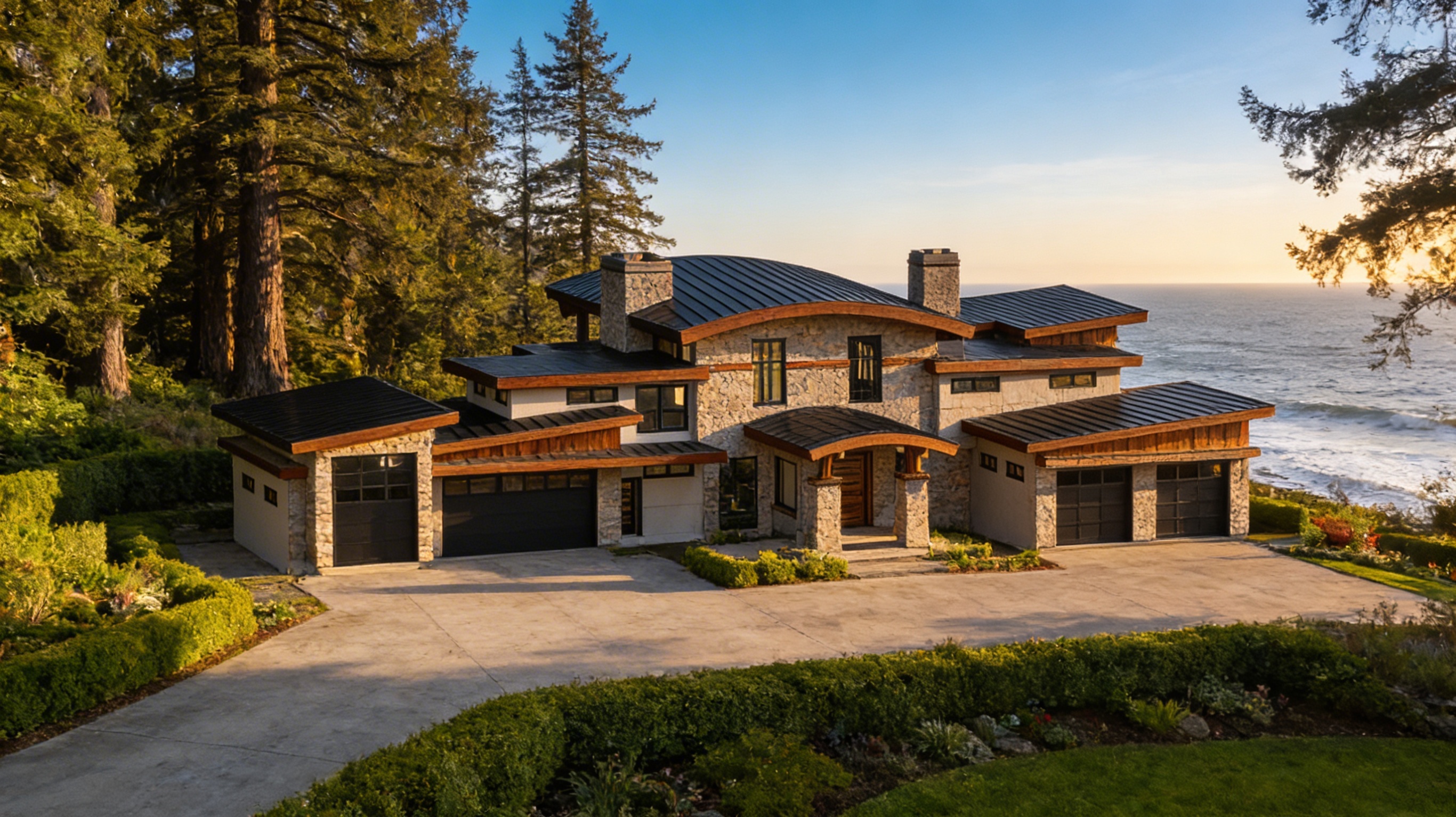 clean modern architectural exterior rendered in cinematic vibrant golden hour lighting with blue skies mountain modern with heavy timber architectural style stone siding beautifully lush green manicured landscape around structure with hedges and gardens black standing seam metal roof prominent cinematic oregon coastline in the far distance with big douglas fir trees surrounding the house and the coastline in the distant background high fidelity photorealistic visualization crisp shadow falloff refined facade geometry soft atmospheric depth premium architectural photography mood ultra clean composition and materials dark trim around windows concrete driveway leading up to the house in the front and goes up to the garage doors on the left and the right