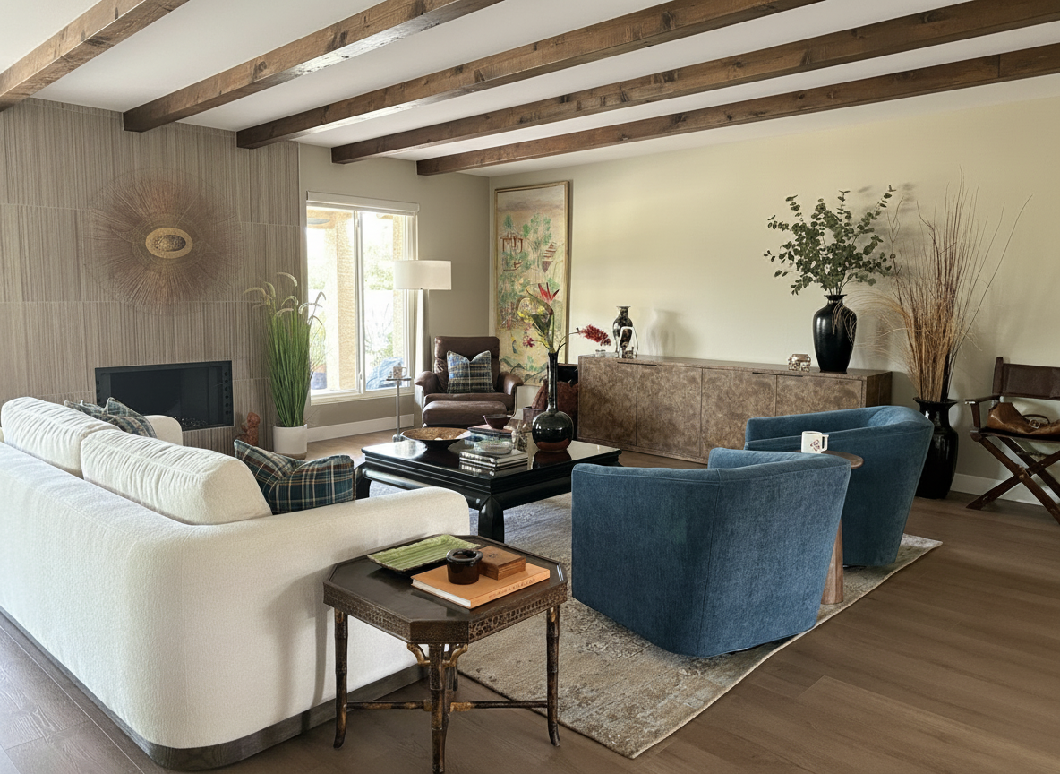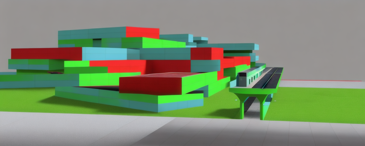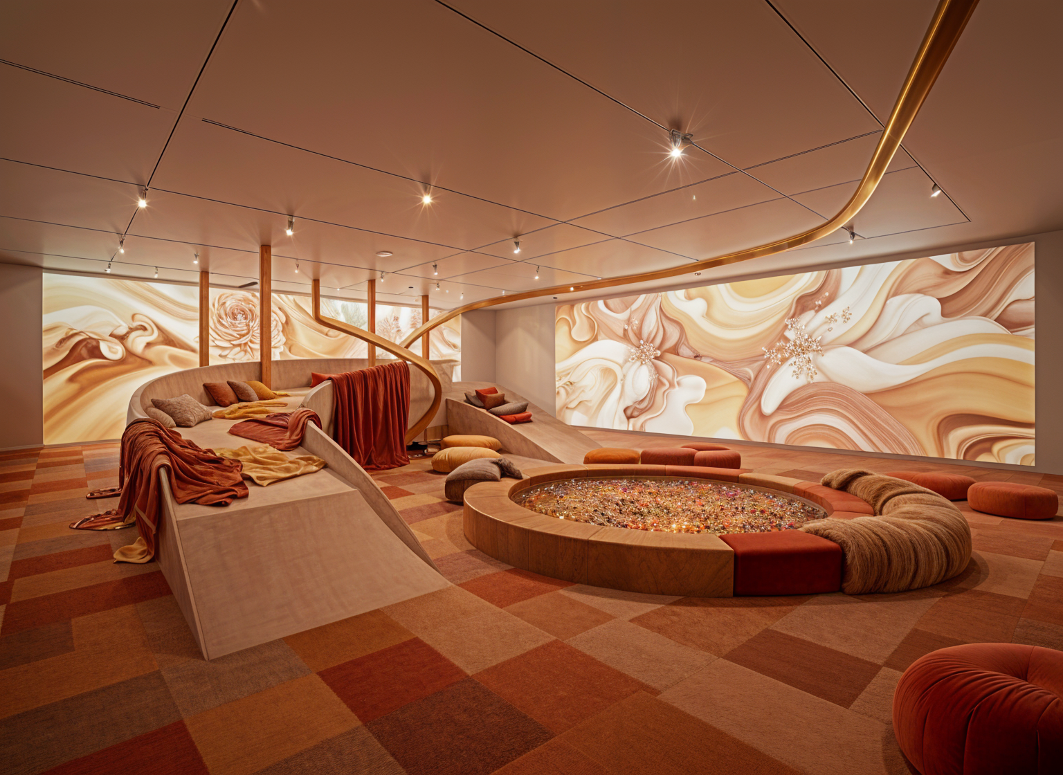 postmodern interior shot postmodern exhibition playground with beats big wooden ramp with fabric on and conversation pit with beads in the middle all warm colour no windows small beads colorful warm colors everywhere and projection in behind and glass tubes more plushy and soft soft floor plush no ceiling no walls just projections beads from ceiling fabric swings and purple yellow orange red colors only architecture