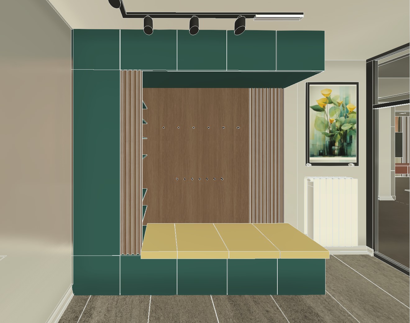 do not change the geometry and colors and materials the ceiling lights should be turned on the floor tiles should have a slightly warmer more brownish tone add shoes in the shelves below and clothes on the wooden wall make the wall on the left to be mirror
