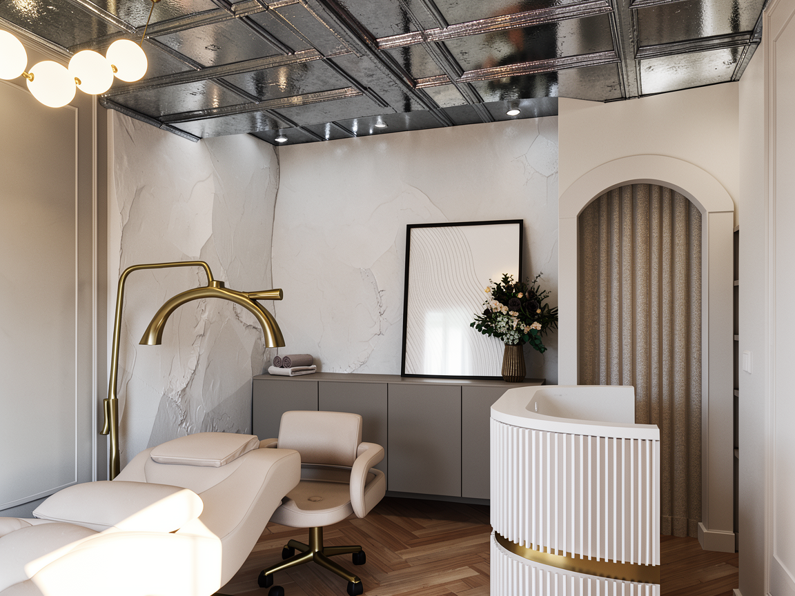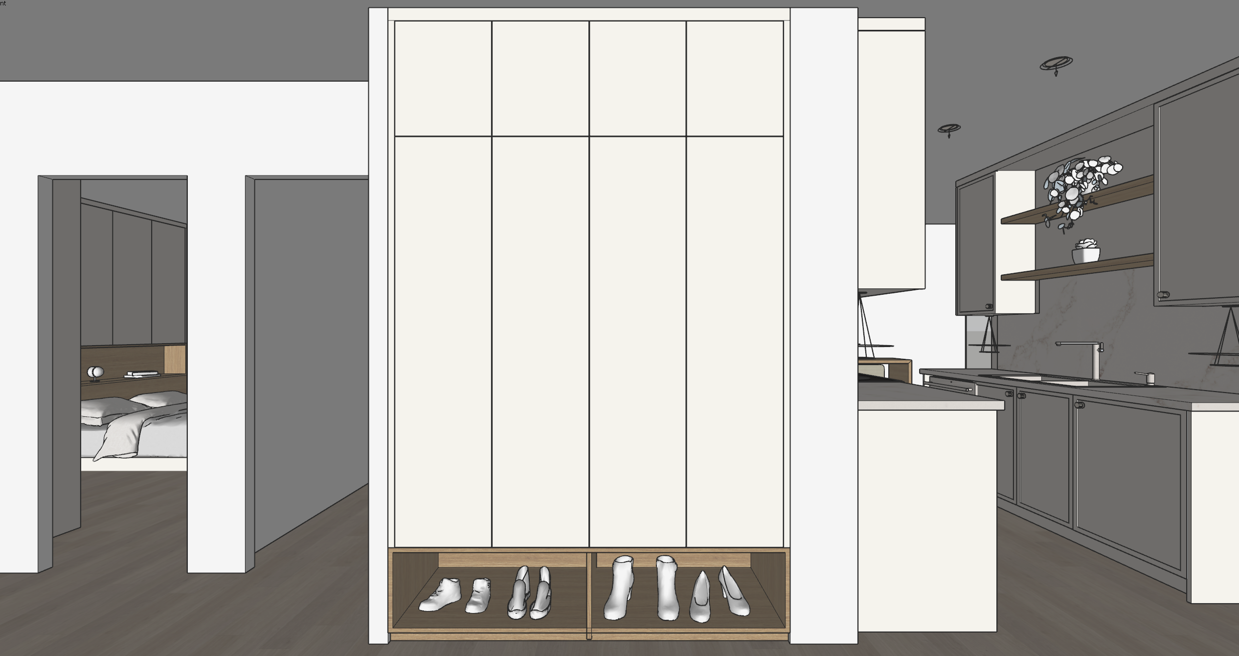 a modern minimalist interior featuring a sleek warm white wardrobe with clean lines and a natural wood shoe shelf at the bottom adjacent to the wardrobe there s a contemporary kitchen with warm white cabinets and a light marble countertop accented by floating wooden shelves adorned with decorative plants the flooring is a sophisticated natural oak wood adding warmth to the space the adjacent bedroom visible through an open doorway has a cozy and inviting atmosphere with soft gray walls and white bedding the overall ambiance is elegant yet inviting with a neutral color palette that highlights simplicity and functionality