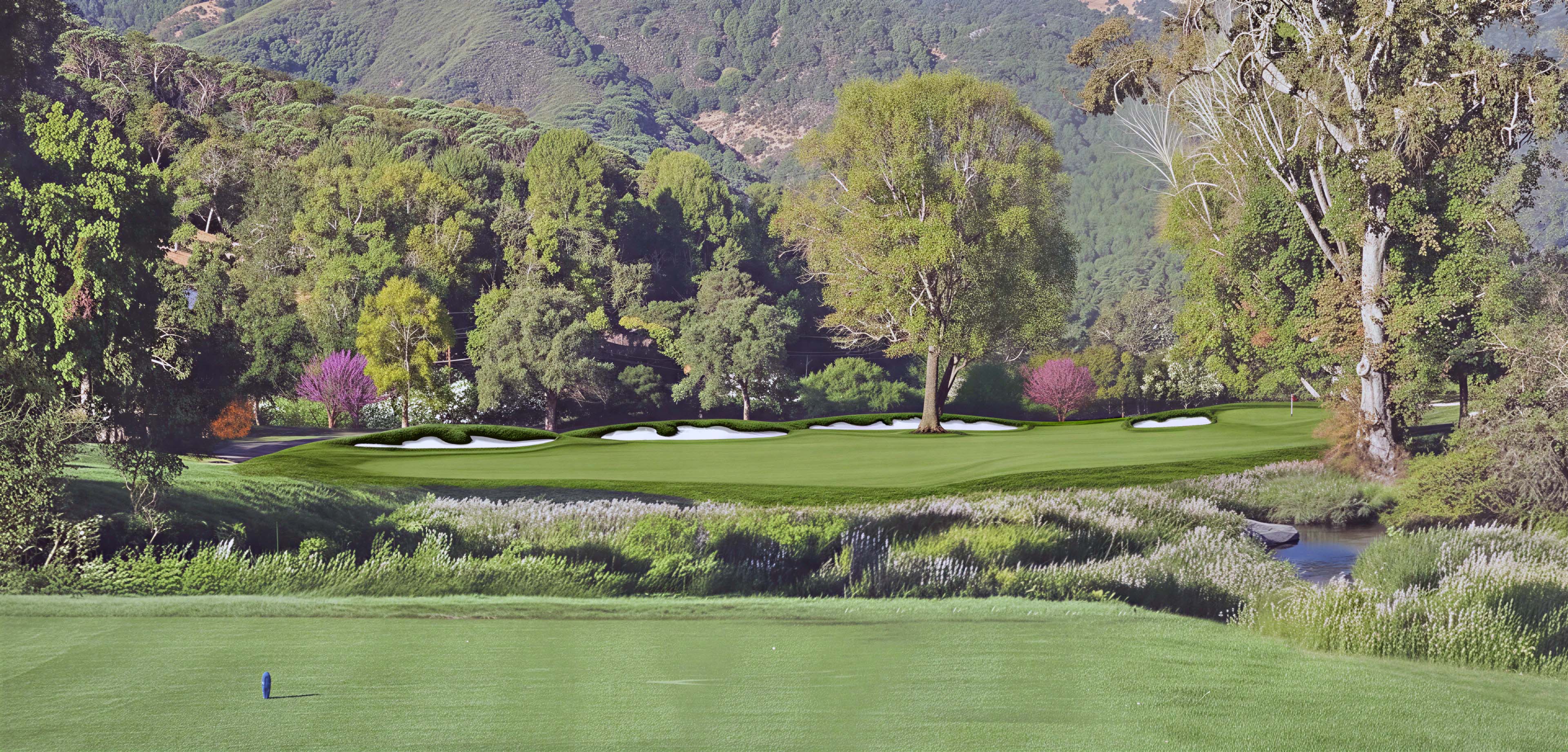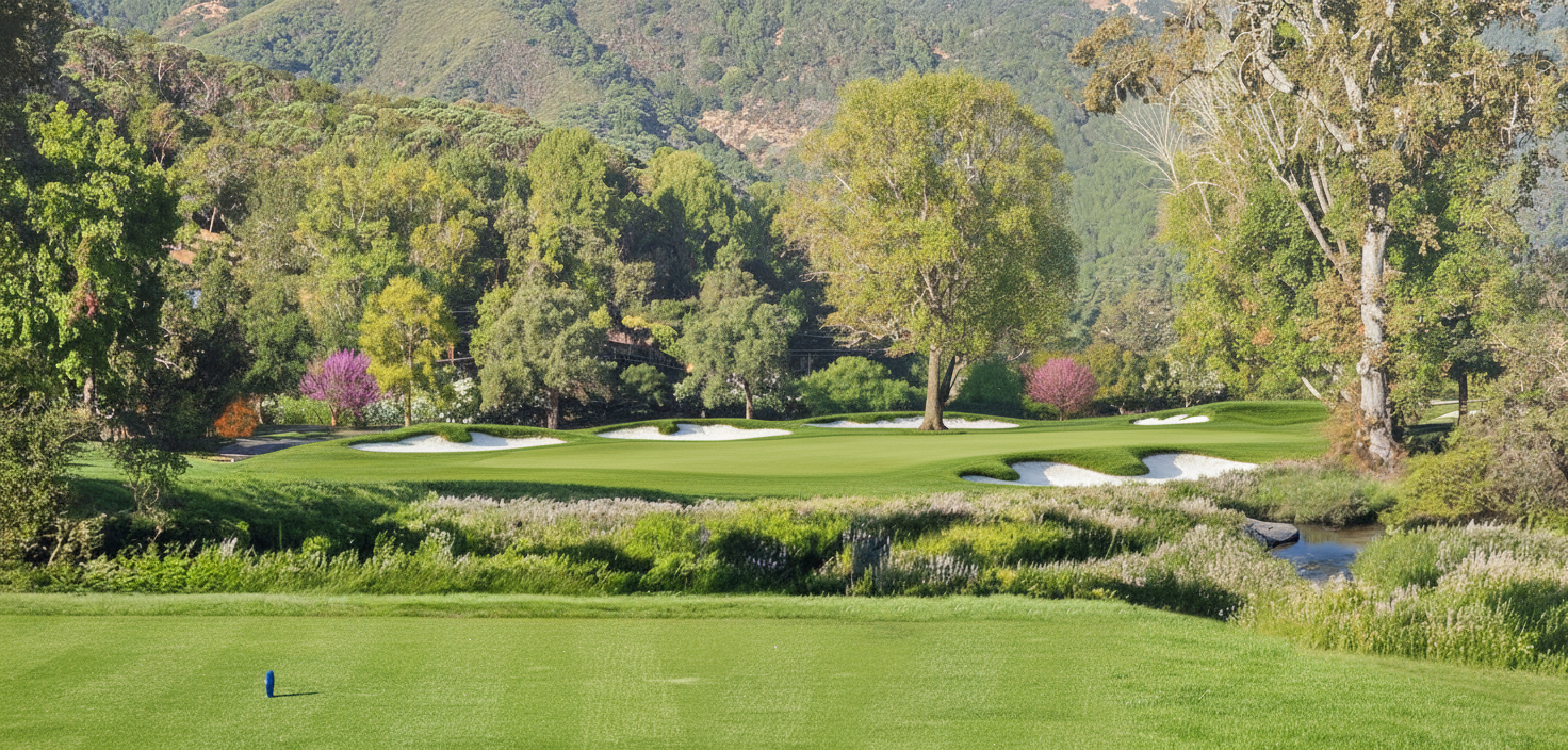 use the attached edited after image as the only base perform a photorealistic correction enhancement pass so that all golf surfaces and the background read as one seamless real photograph absolute locks highest priority do not change geometry edges or locations of any golf elements tee fairway rough approach green collar bunkers do not add or remove any features no new bunkers no reshaping bunkers no bunker count change do not alter camera perspective framing horizon or composition this is a color lighting material realism pass only primary goal global photo match apply a single unified professional photographic grade across the entire frame background golf features to eliminate mismatch refine brightness exposure so highlights and mids match naturally between added turf and existing landscape balance contrast for clarity without hdr or crunchy shadows correct hue and white balance so greens share the same warm late afternoon ambient tone adjust saturation vibrance to rich but natural private club turf no neon no dull patches ensure consistent light direction and shadow softness everywhere secondary goal micro realism upgrade inside existing footprints only improve realism of golf surfaces without changing shapes fairway add true leaf level stochastic turf texture subtle mowing grain aligned with play natural sheen remove any flat photoshop pattern feel maintained rough deepen texture and tufting keep 3 4 inch maintained rough look feather transitions while staying on existing edges green collar smooth photoreal putting surface slight specular glint believable micro contours harmonize tone with fairway bunkers keep exact outlines boost realism with stronger grass face depth sharper lips real sand grain and correct late afternoon cast shadows seam blending fix any visible seams or color steps between added turf and surrounding photo colors should merge naturally with soft believable edge transitions while respecting all existing boundaries style lock final output must look like a real camera photograph shot in late afternoon at marin country club no rendering look no photoshop fill look no painterly smoothing strict negatives must not happen geometry change edge drift redesigned shapes added bunker extra bunker deleted bunker new hazard removed fairway missing fairway recompose crop zoom tilt stylized illustration cgi hdr surreal flat texture repeating grass pattern airbrush posterization output the same image same shapes same view just fully harmonized photographic color light and upgraded micro realism so everything blends perfectly