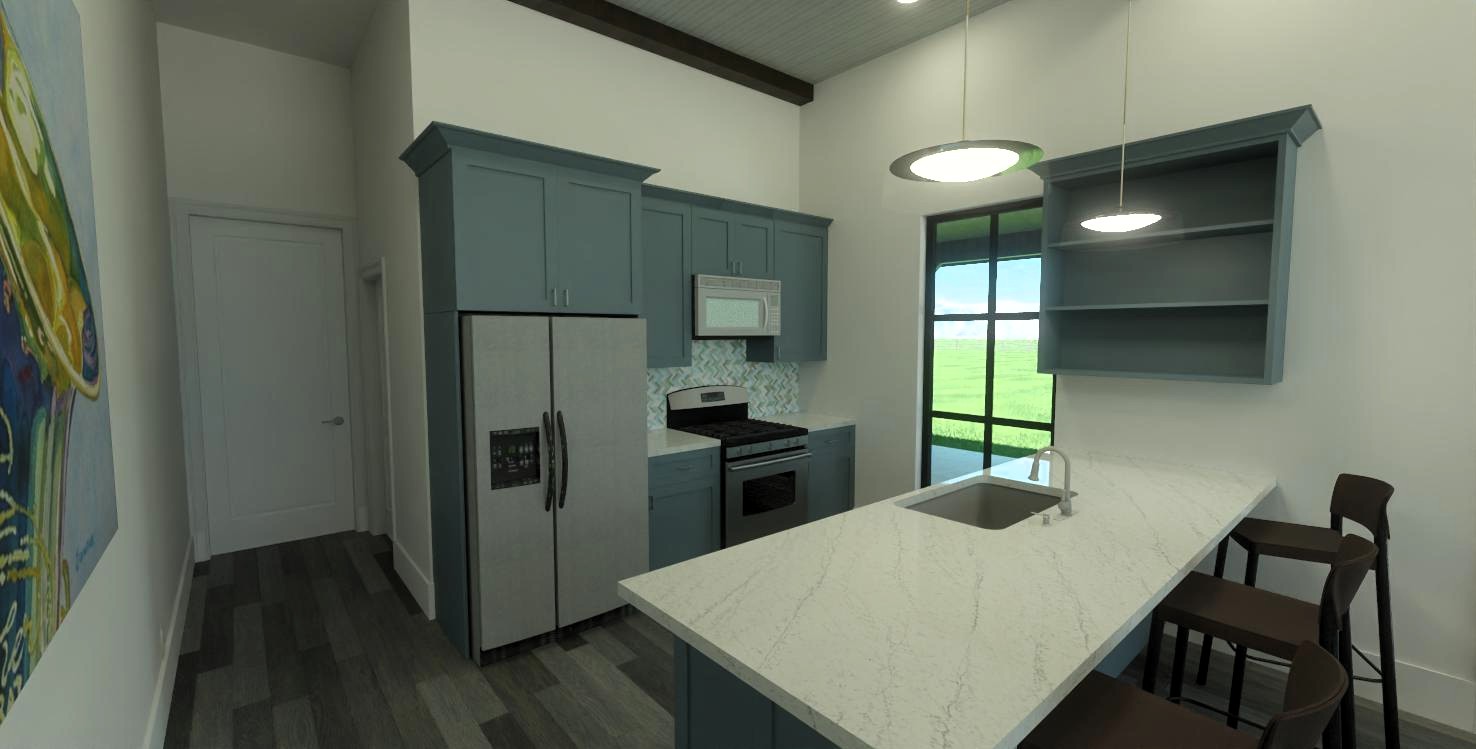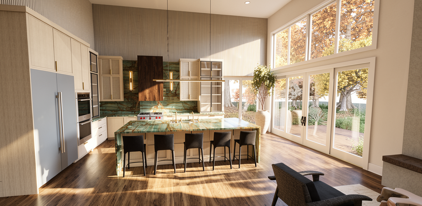 use the exact same interior layout shown in the image do not change or move any walls doors windows or room sizes do not change the kitchen layout cabinet configuration or cabinet style do not move remove or replace any furniture keep all furniture in the same locations and orientations this is a fixed architectural plan the spatial layout is locked and unchangeable you may only update materials finishes colors lighting d cor do not modify the floor plan openings furniture arrangement or kitchen design in any way any change to the layout is an error add decorations on cupboard
