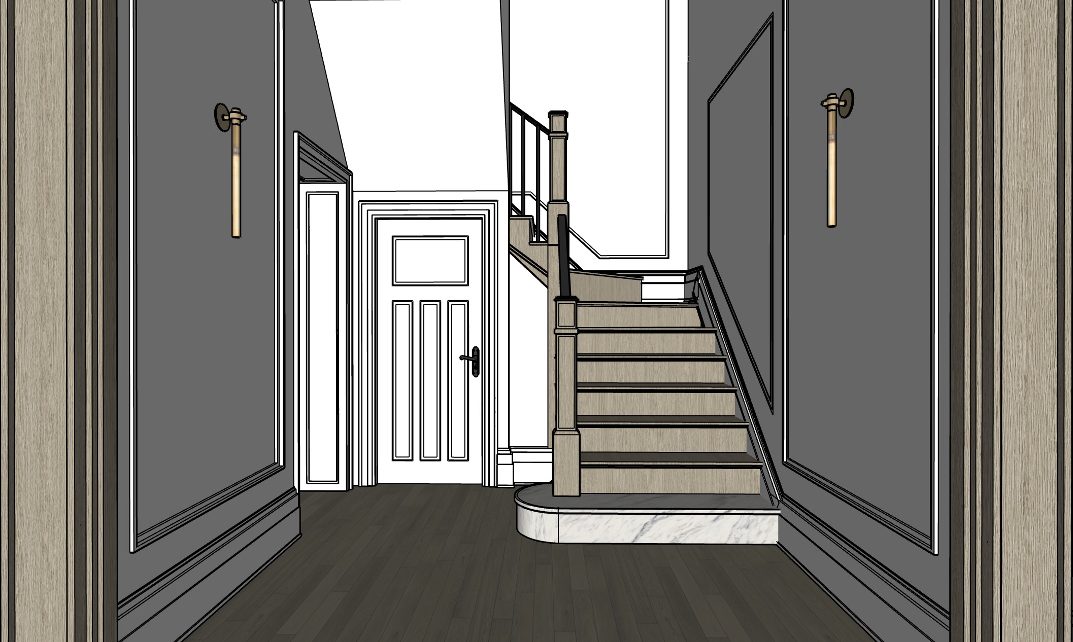 theres no window in the back door put the the railing and the bar of the staircase in black metal all the walls baseboards and door should be white a tiny bit off white