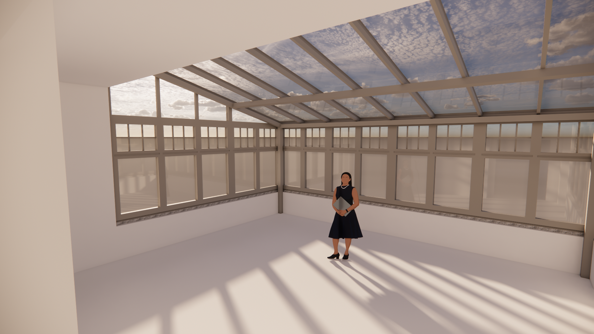 modern sunlit room with large windows beige walls and glass ceiling soft sunlight casts intricate shadows on white floors a person stands elegantly wearing a dark navy dress and black shoes holding a light gray folder the atmosphere is serene and airy with a clear blue sky visible through the windows giving a sense of tranquility and openness cozy living room furniture to fill in the conservatory without plants