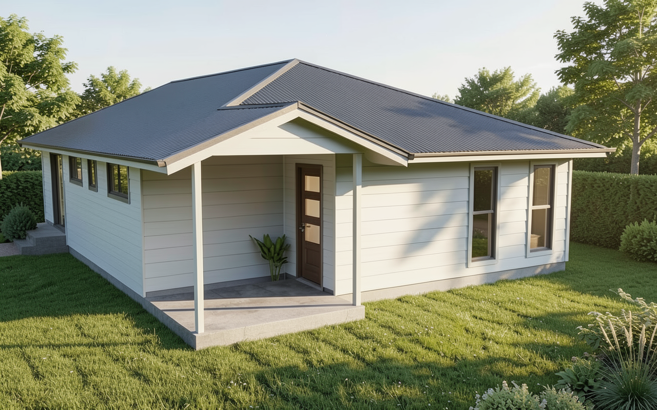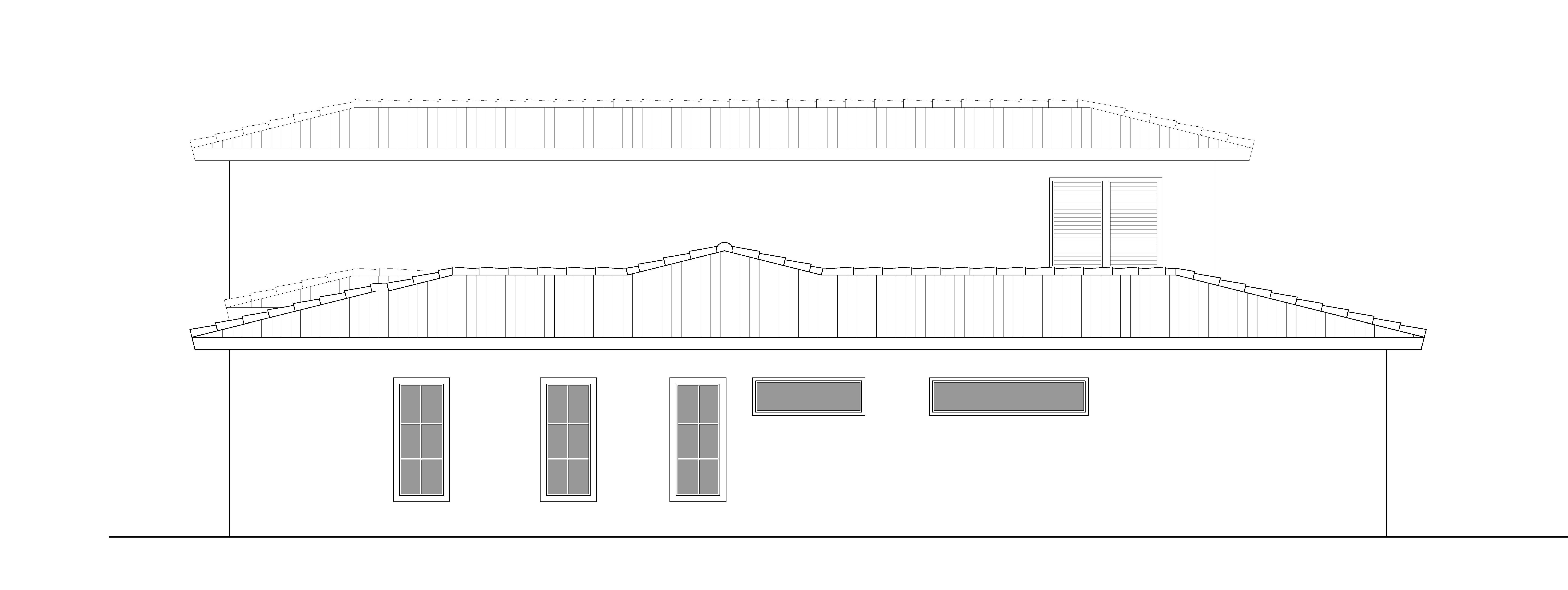 flat tile slate brown roof white walls brown frame at windows doors and mullion clear glass tropical landscape