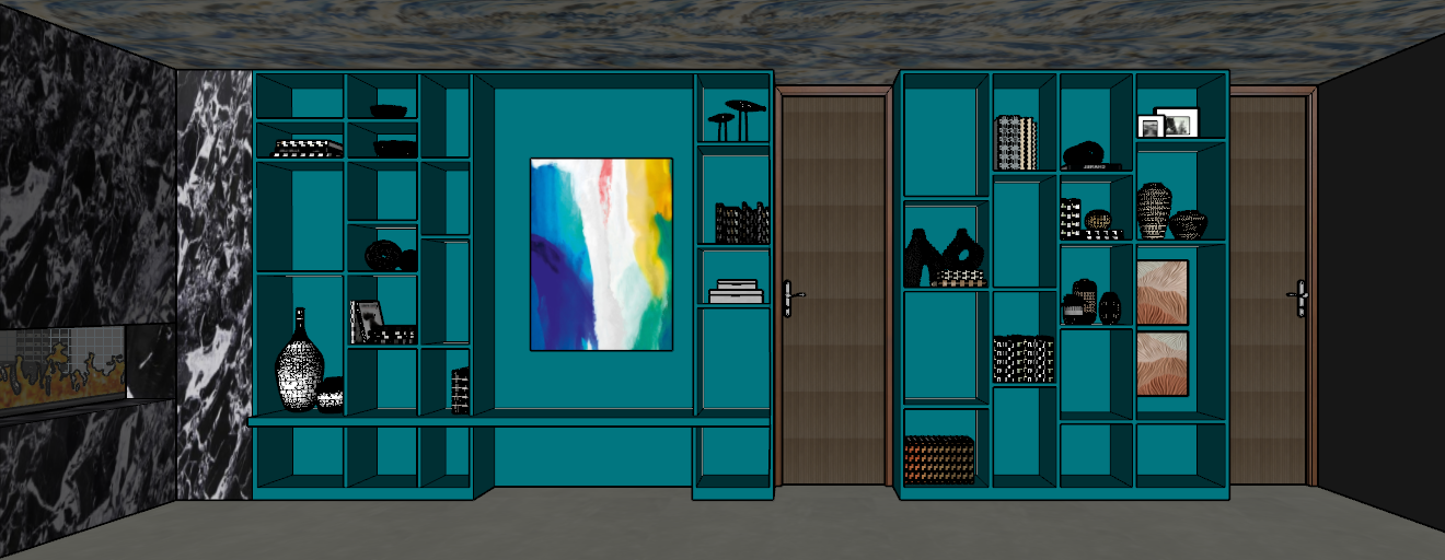 the room has no windows wall on the right side is a mirror make the fireplace a little realistic make the teal blue color in the bookcases deep the right wall is a mirror wall to ceiling the size of the whole wall remove the corner plant make the image a little brighter and ass lighting on all shelves no sunlight