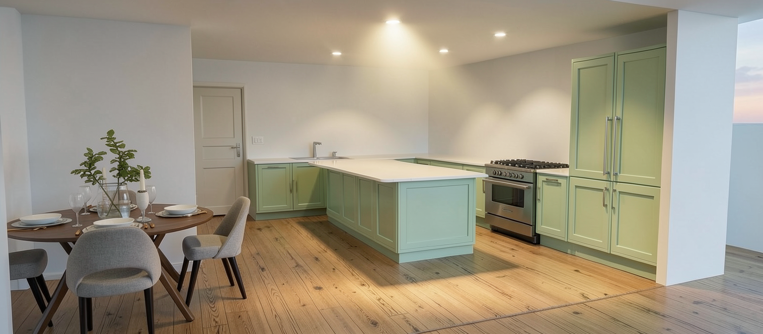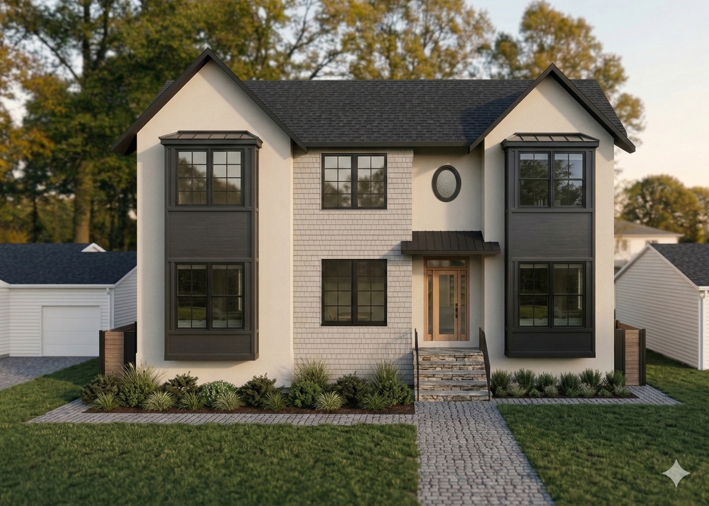 render a modern house with a warm inviting atmosphere the facade is predominantly off white with charcoal gray accents on the window frames and roof the door is a natural wood tone leading up from stone steps the atmosphere is serene with lush green grass and a paved stone walkway surrounding the house are vibrant green shrubs with an autumnal backdrop of trees displaying hints of golden yellow and soft brown the sky is a clear blue suggesting a tranquil sunny day