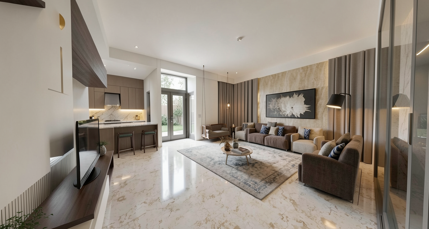 a modern rustic man cave games room the room contains a golf simulator with a fake grass green floor and black fabric walls the sofa by the golf simulator is ultra realistic super puffy medium dark grey ultra comfy leather like vinyl with 2 complimenting cloth throw cushions decor at the sofa end arms and two soft throw blankets other items include shuffleboard with black weights nhl super chexx pro bubble hockey with black base and oilers logo on the base poker table behind the bubble hockey trimmed in black leather the tv s on the far wall are displaying a high definition blue jays game on the top tv and a high definition golf simulator game on the bottom tv the tv on the right wall above the poker table is displaying a high definition edmonton oilers game the bottom 42 of all exterior walls are finished in galvanized vertical corrugated metal capped at the top with a small wood sill with underlighting that accents the corrugated metal no lighting at the bottom of the corrugated metal the bar wall is a feature wall finished above the corrugated metal with horizontal medium large planks of rustic reclaimed wood the other walls are painted benjamin moore simply white the cabinets against the reclaimed wood wall are a walk up bar with three open wood shelves above each shelf has a subtle led strip along the top back edge that shines light up the wall add alcohol bottles to all three shelves no toe kick lighting on the bar cabinet personal ice maker on the right side of the light colored granite bar top cabinet hardware is a flat black metal finish soft natural light coming through the windows and pot lights throughout providing gentle ambient soft mood lighting make all the wood for bar cabinets bar shelving table chairs and corrugated steel trim a medium dark wood grained birch the floor should be a medium dark gray cut and polished concrete floor preserve the original image as a background plate do not add windows keep everything else unchanged forbid geometry reconstruction