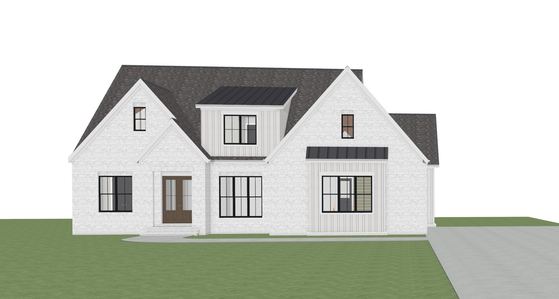 render a charming modern farmhouse with white brick walls and black window frames the roof is a deep charcoal gray adding a striking contrast the front door is a rich warm brown set the scene during a golden hour where the soft sunlight casts a warm glow over the house enhancing its welcoming appearance the lawn is a lush green and a smooth gray driveway leads to the entrance the atmosphere is peaceful and inviting evoking a sense of home and tranquility add landscape mulch beds along the front of the home and add small shrubbery and flowers