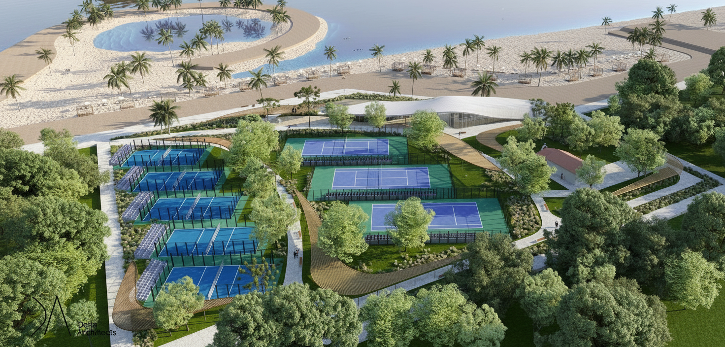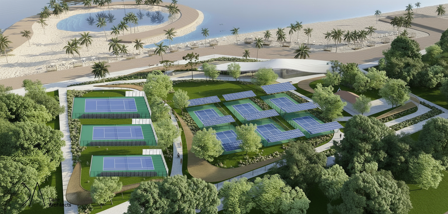 i have edit the image in the photoshop and i placed the courts draft so i want to edit the image to place again the courts to have the final best result do not change the orientation the scope is to have a result realistic and right also correct the courts to have the right appearance do not put any shelters at the top of them