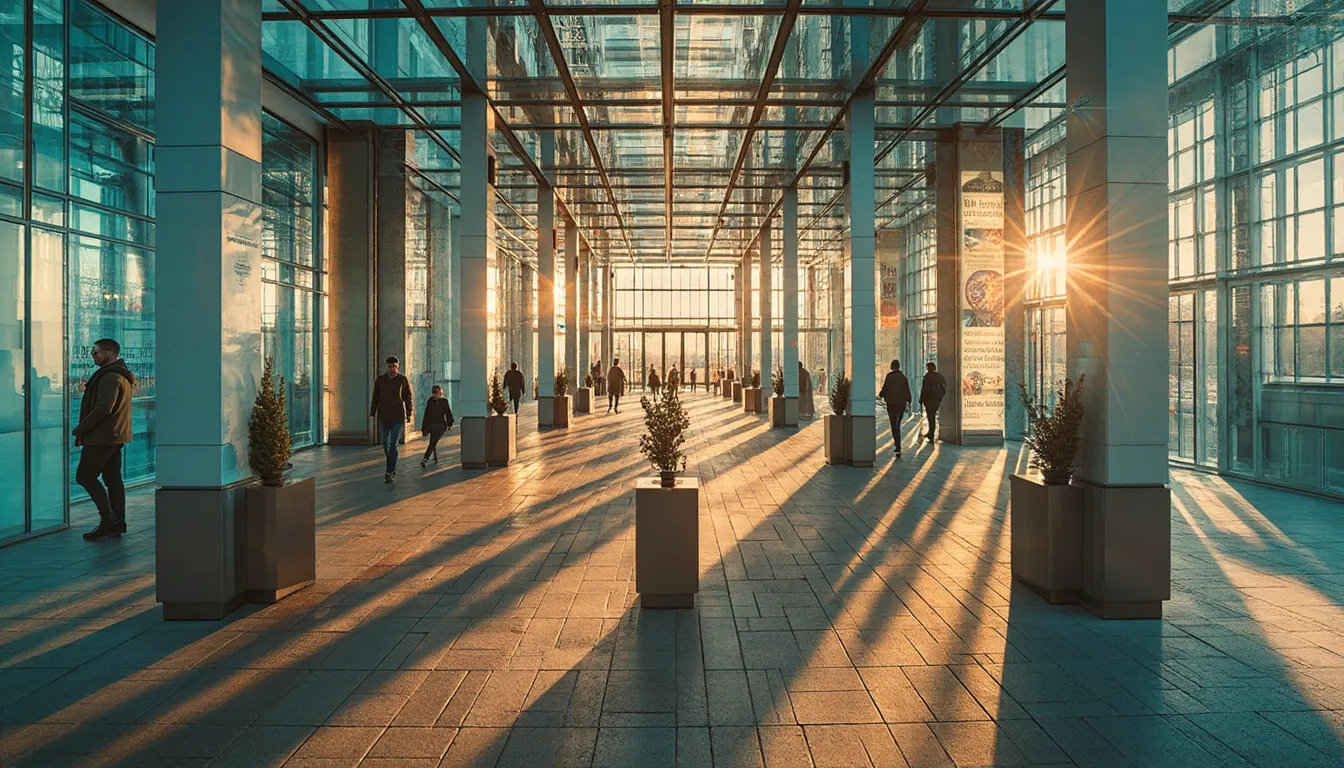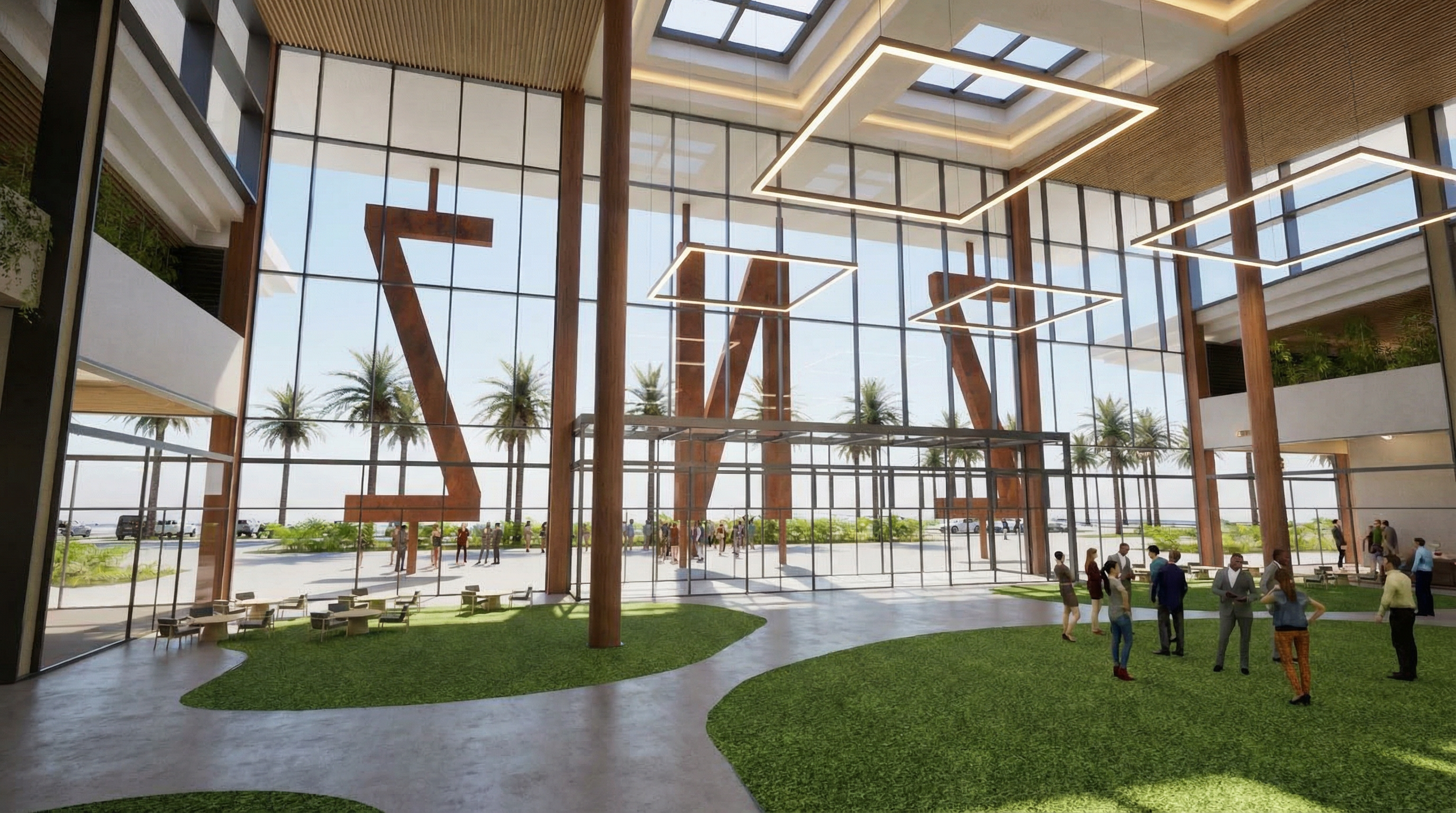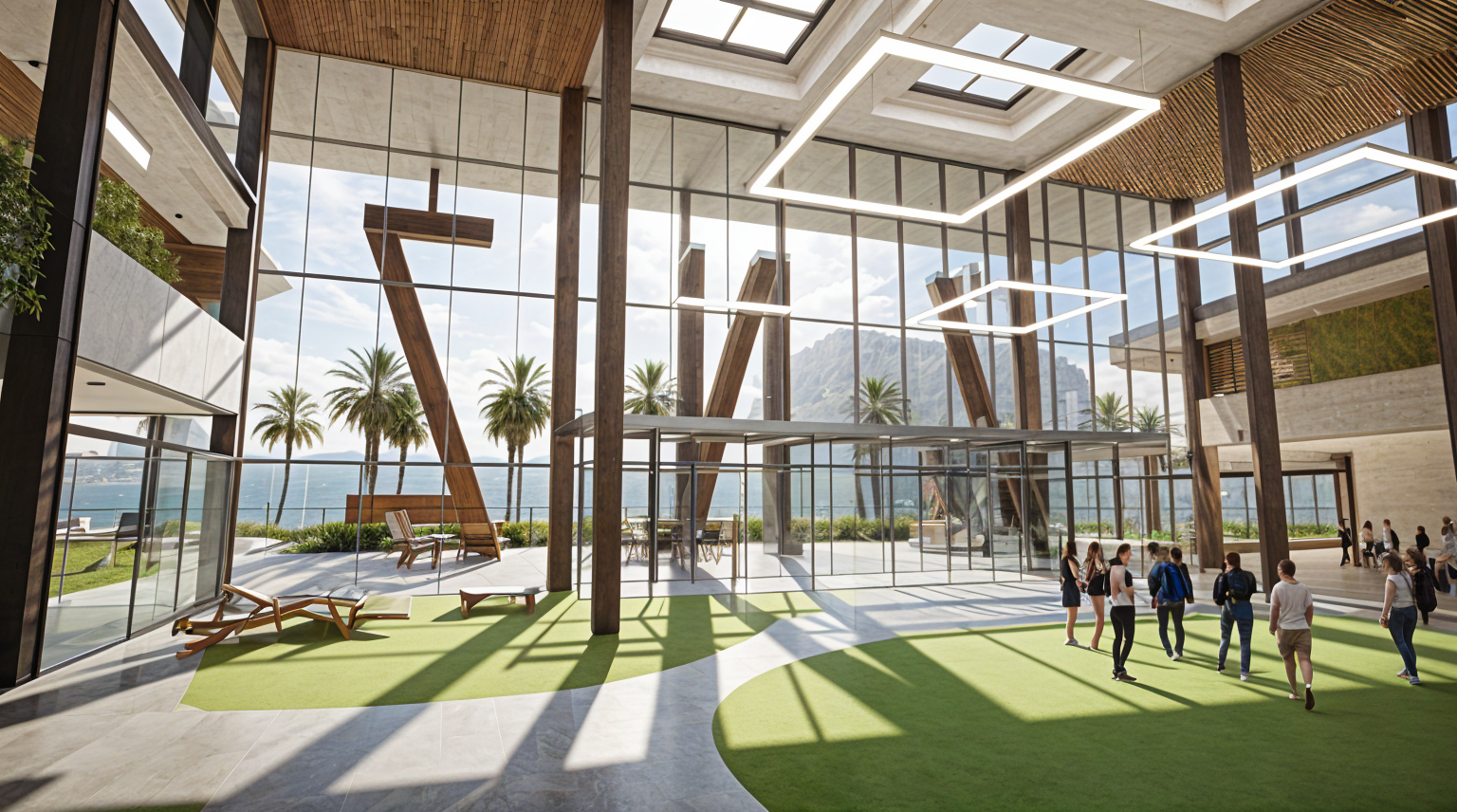 entrance to a modern luxurious ferry terminal with a curtain wall grey concrete flooring with green concrete shapes