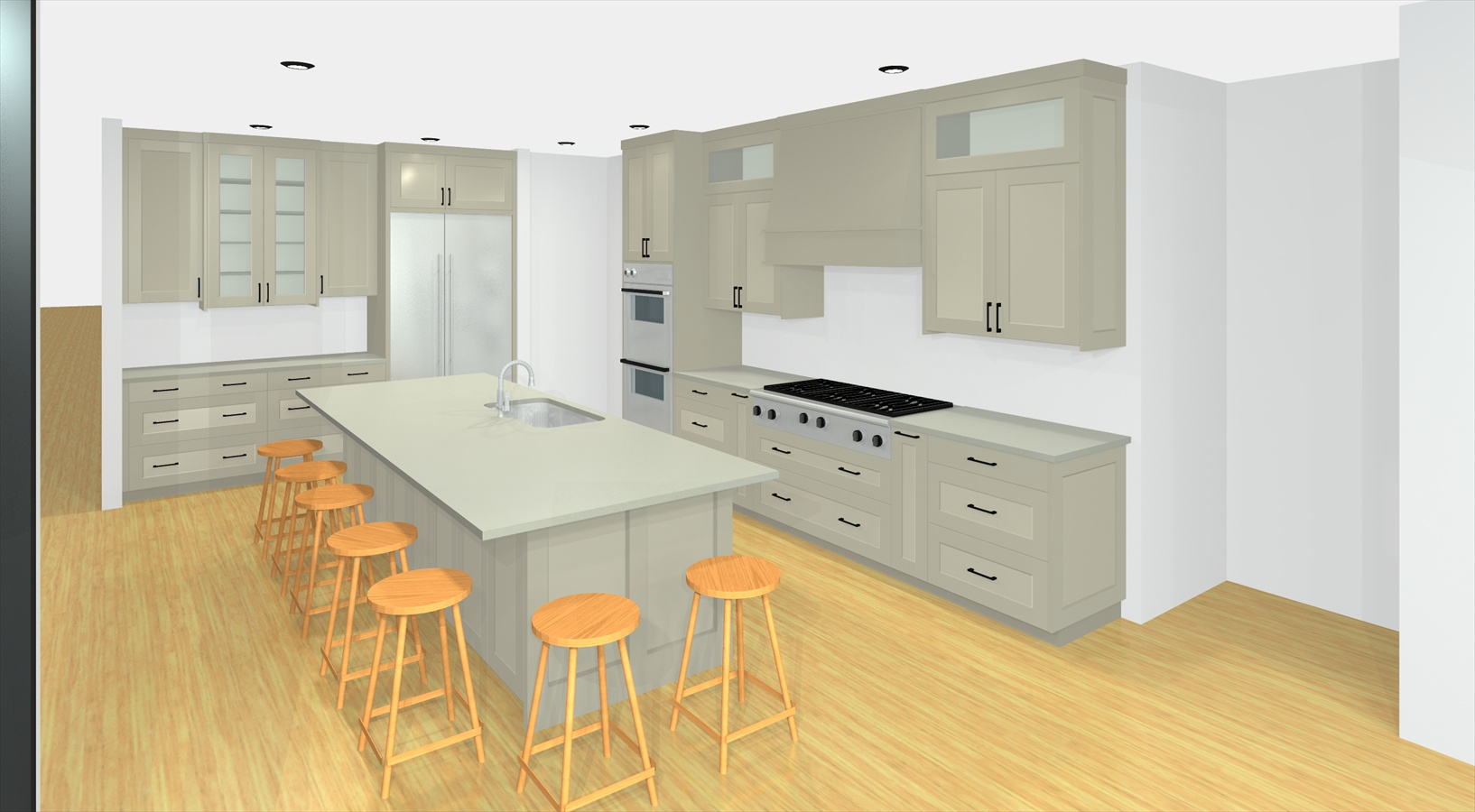 create a stunning modern kitchen with soft gray cabinetry and a serene atmosphere feature sleek stainless steel appliances and elegant black hardware the countertops should be a light sophisticated stone color include warm wooden stools around the island to complement the natural wood flooring the walls should be a crisp clean white to enhance the airy feel while recessed lighting adds a subtle ambient glow