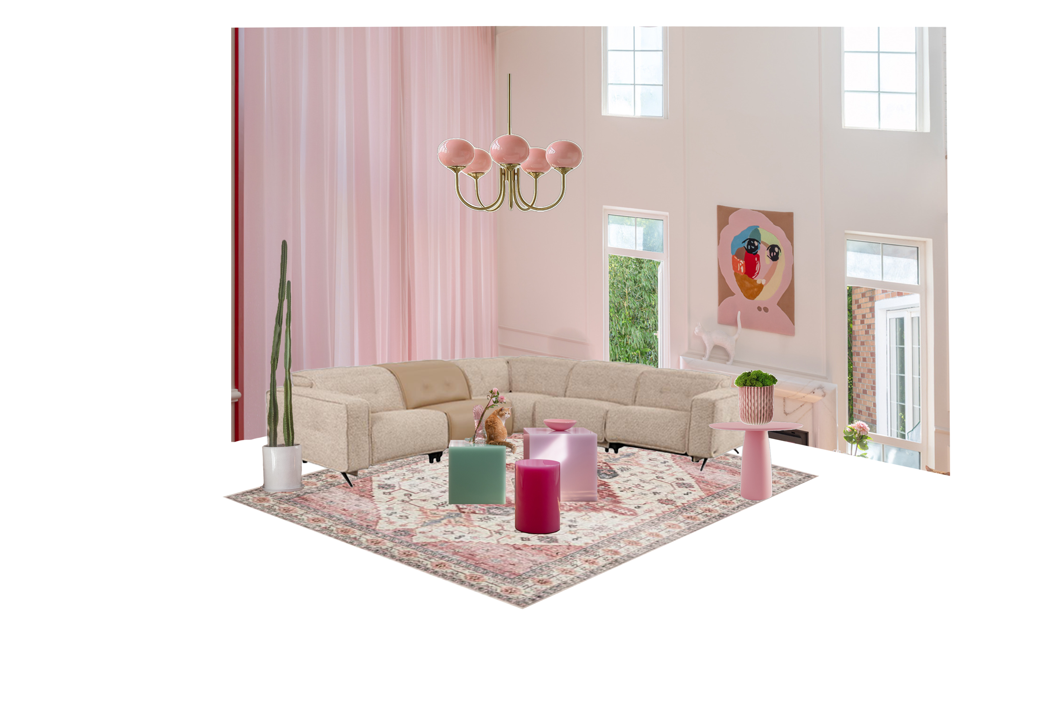 create a warm and comfortable mid century modern and colorful large flat and spacious living room to create a soft and elegant atmosphere the background wall has a modern decoration style composed of various pink lines in the center of the living room a fluffy beige l shaped sofa is placed surrounded by a soft pink and cream vintage rug a small pink round table is placed on the table with a green potted plant and the floor is made of natural wood in addition there is a bright pink cylindrical table and a translucent pink square table modern art works with warm toned abstract shapes are hung on the walls and floors and a chic pink spherical brass chandelier hangs above the head through a window the iconic building is outside use soft decorative elements and tall cacti planted in white pots to embellish the space and add a touch of green adjust the lighting to create a warm and pleasant atmosphere