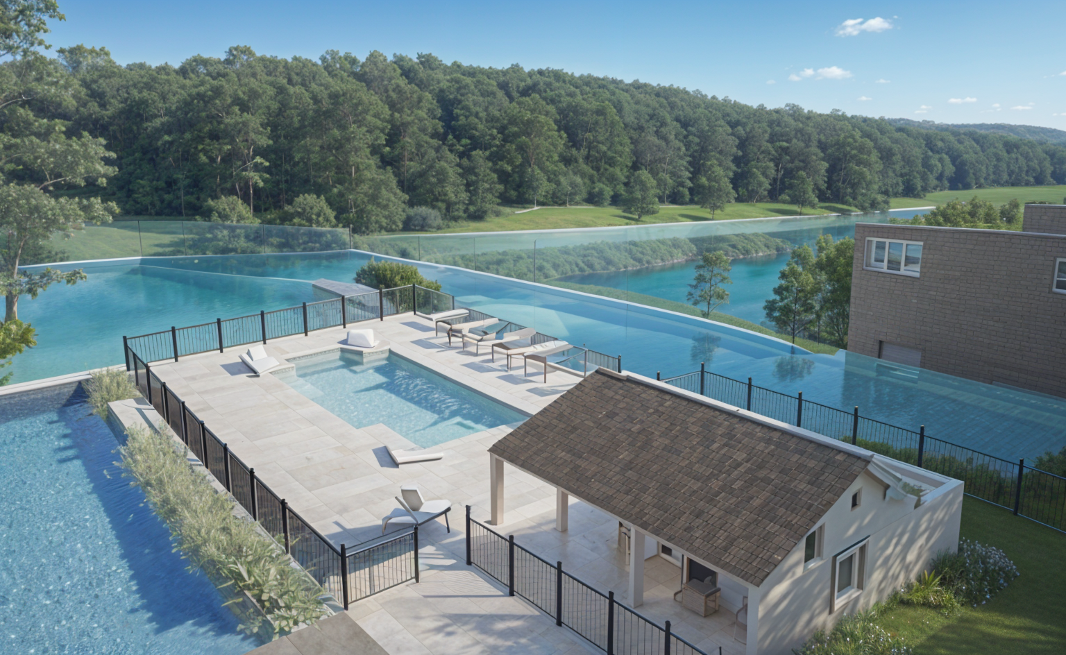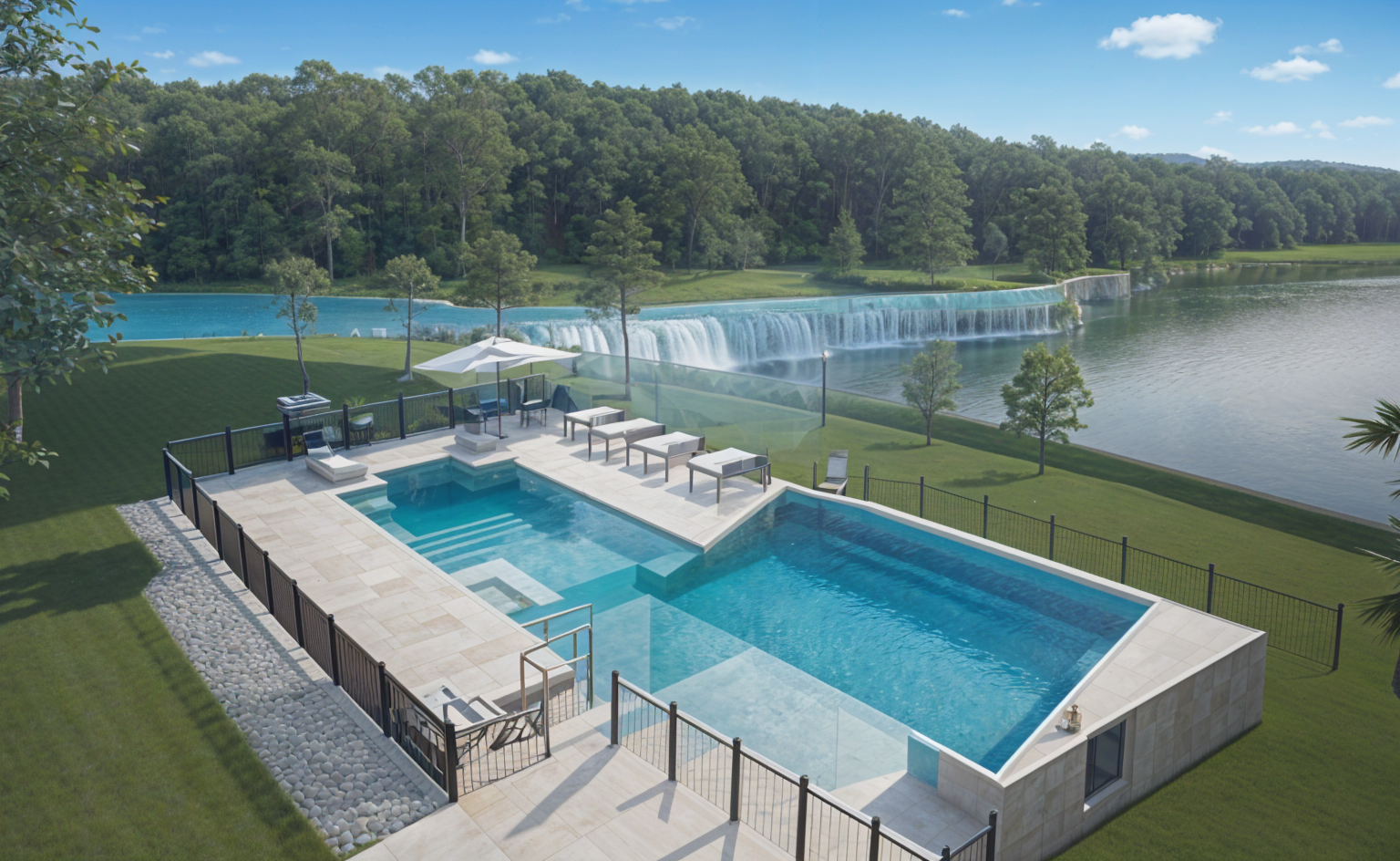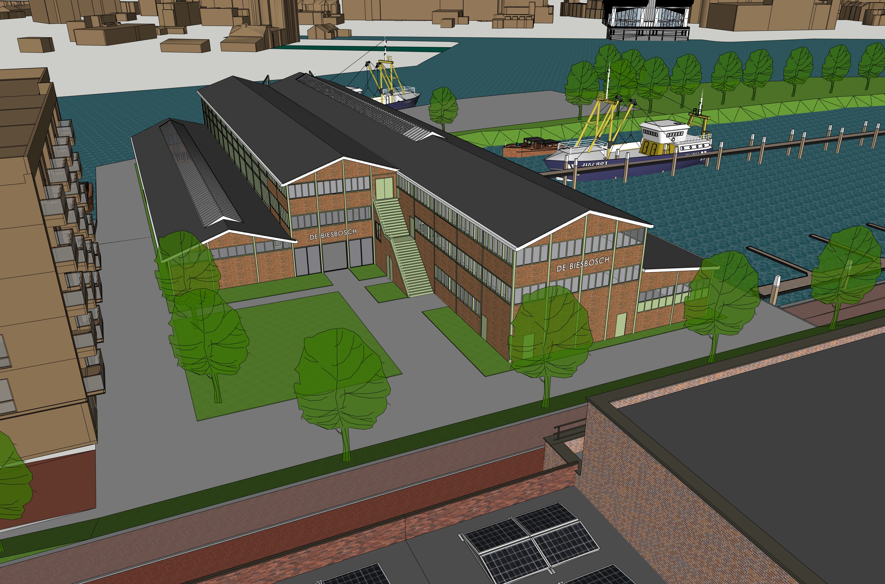 add lots of people around the buildings and a terrace with plants tables and vibrant city life between the building and the river keep the texts on the building they spell de biesbosch