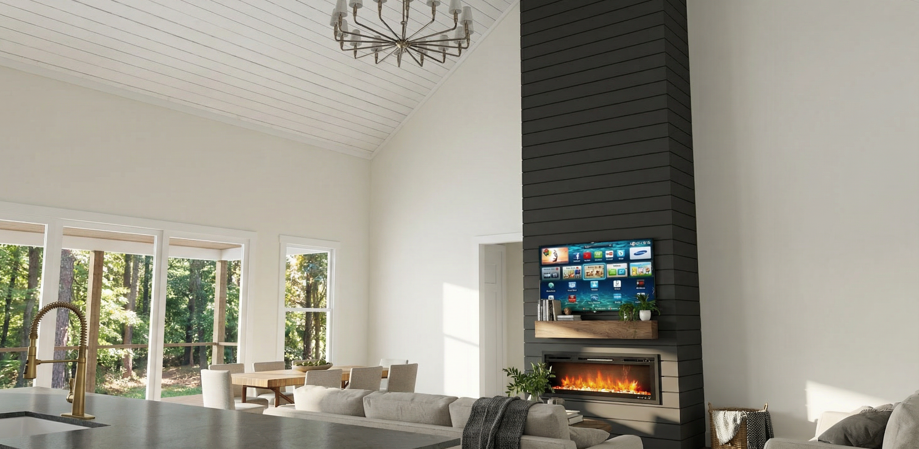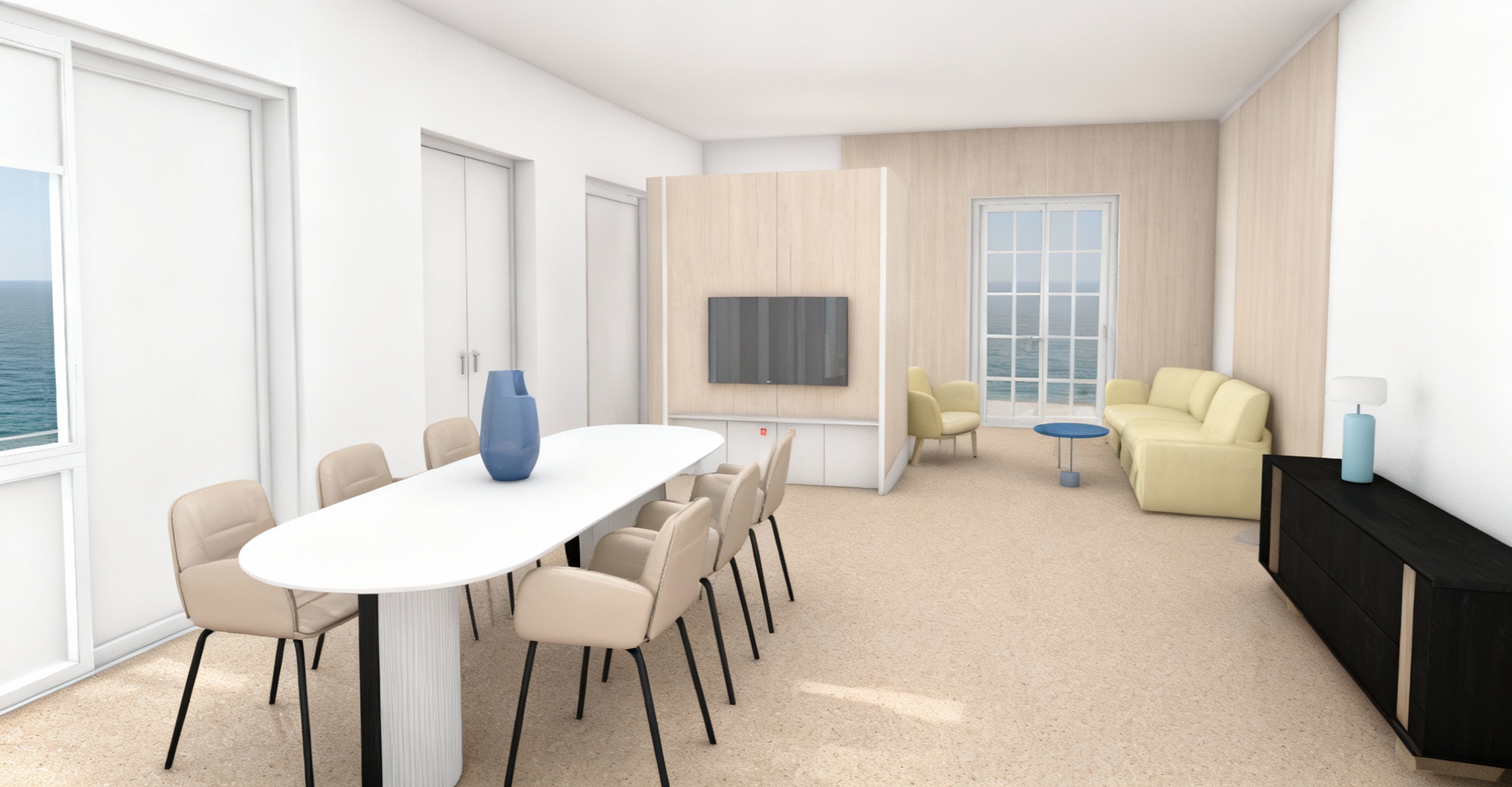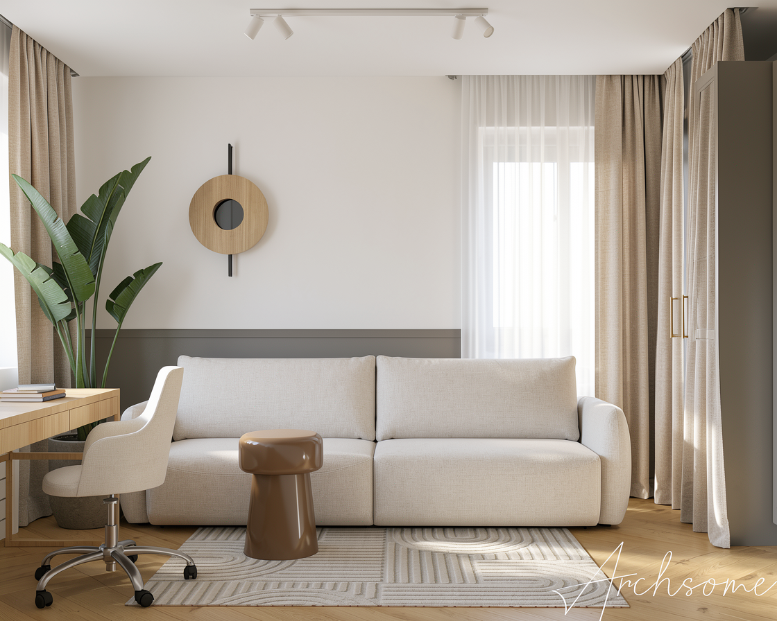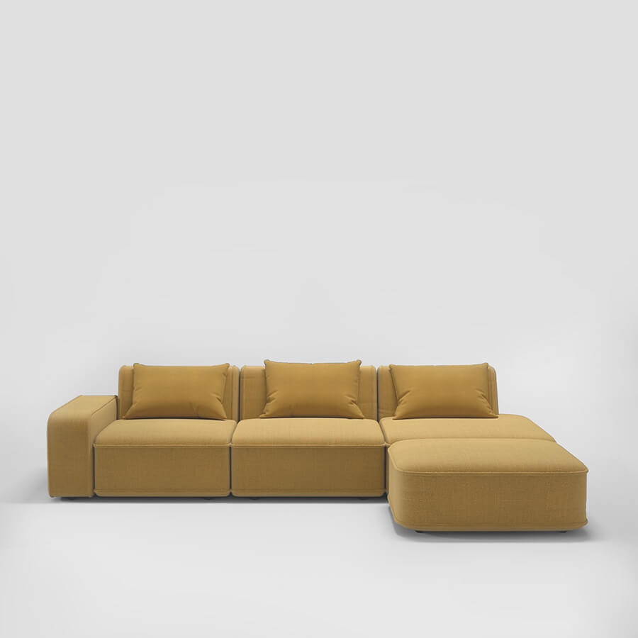 place this sofa in a room with a smooth black background not tiled make sure it takes up the entire back wall add a ceramic checkered floor and a concrete tall celing place a window on a full wall so natural light comes in make sure the sofa is the main focus of the composition use colors and textures that go well with the sofas yellow color do not change anything absolutely anything about the sofa maintain the sofas texture position and color exactly the same add a modern lamp and a small modern coffee table to the scene make sure the scene is unique make sure the room is big the sofa should not take up all of the space in the room add a dark red artwork on the black wall