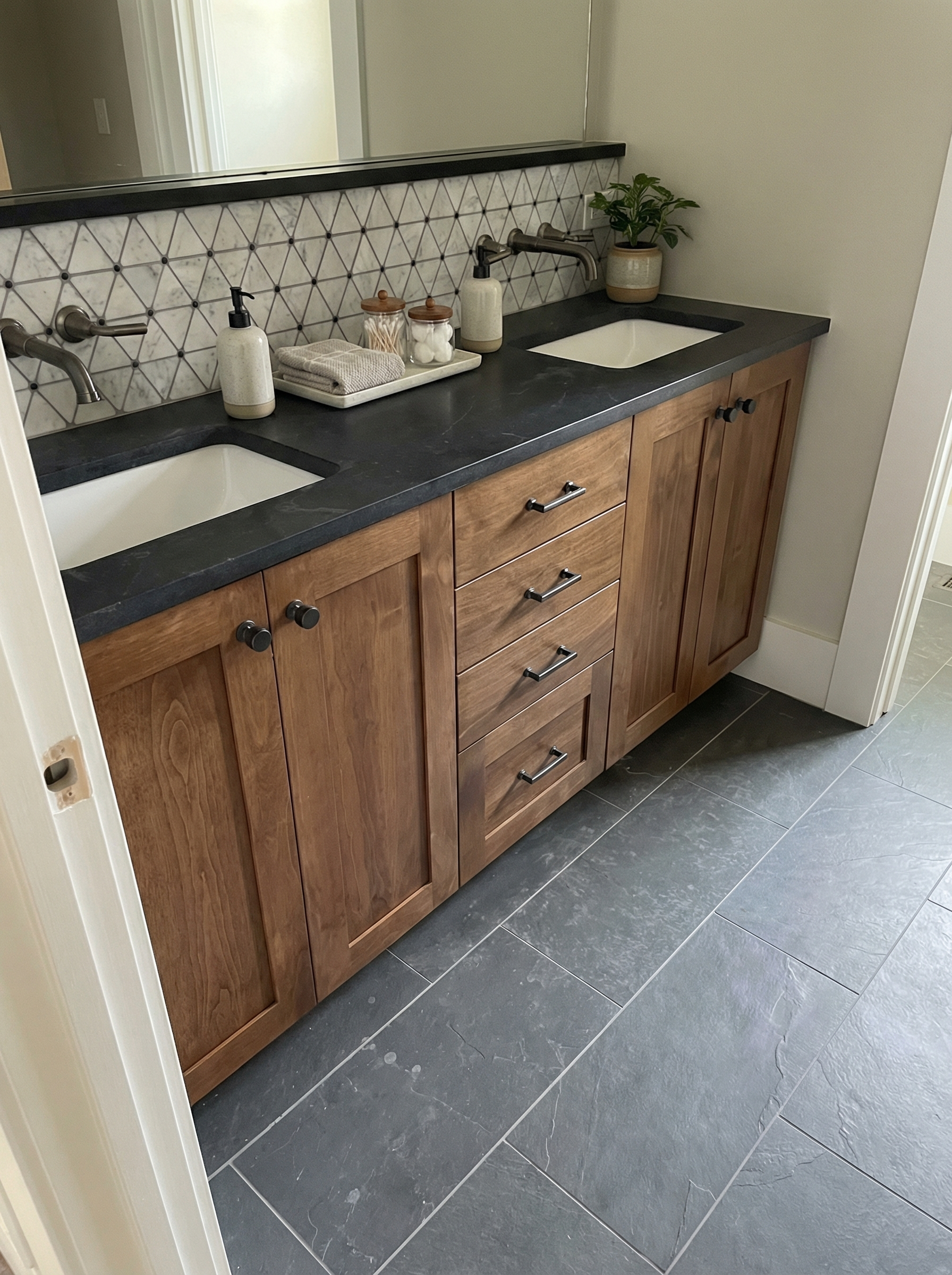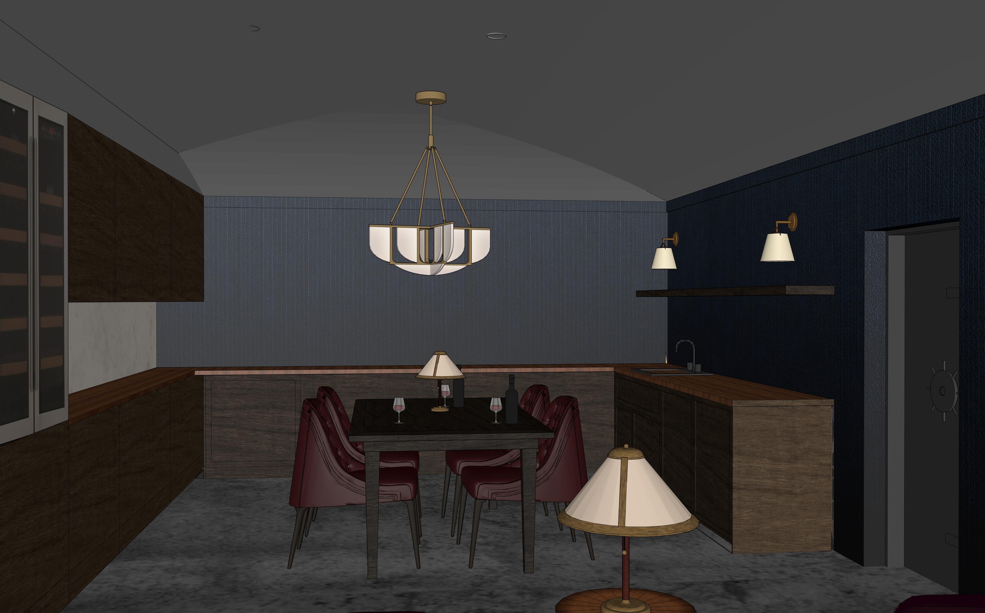 navy blue simple wall paneling warm lighting moody 1920s speakeasy style make ceiling navy blue