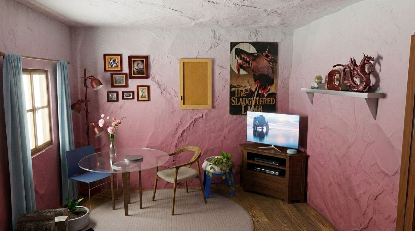 change table to smal simple wodden table with alpine wood chairs around all looking a little different make shelf wodden on the right patina on walls and carpet old curtains ad clutter
