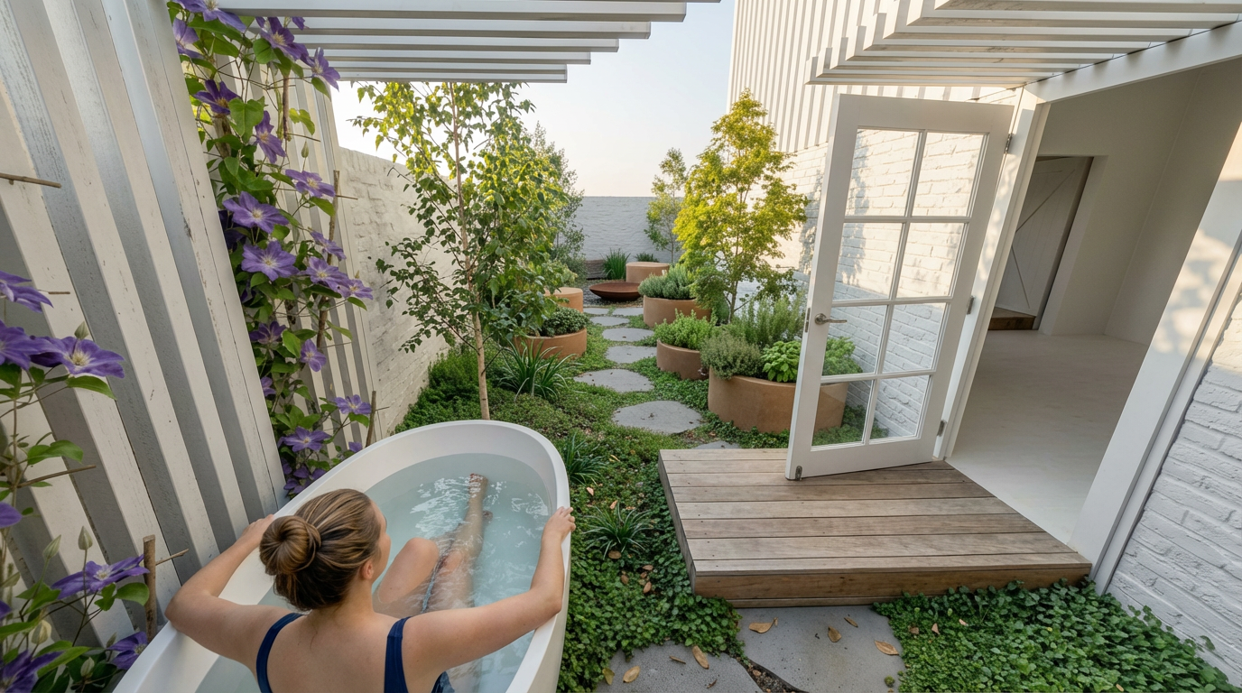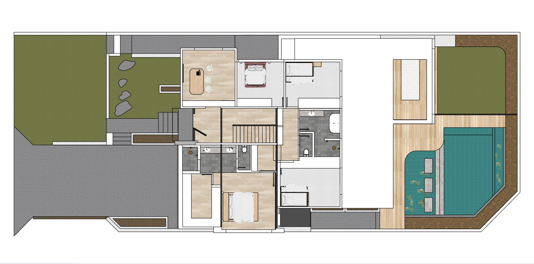 photo render realistic where the big white roof section is include a rooftop garden that is filled with the following plants cousin it dychondra silver falls santolina lavender cotton sedum autumn joy