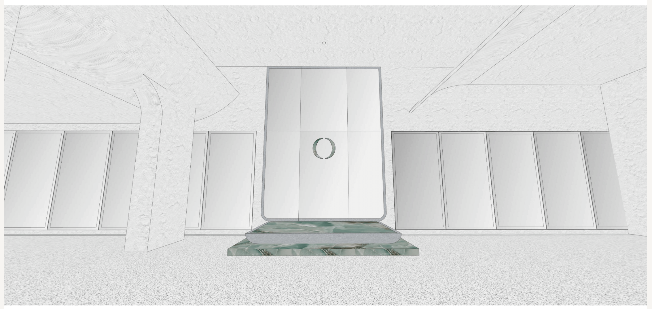 archsynth prompt op ryde motion studio entry photorealistic architectural render of the provided sketchup model strict mode preserve the exact architecture geometry proportions wall panels columns ceiling forms and steps exactly as modeled do not add remove or modify architectural elements only enhance materials lighting and atmosphere project one playground ryde motion studio entry moment lighting the space is fully underground with no natural daylight lighting should feel dramatic sculptural and atmospheric similar to a luxury wellness sanctuary create concealed linear architectural lighting washing the walls soft uplighting around the steps and platform subtle grazing light across the textured plaster walls gentle top light highlighting the circular logo on the door lighting should produce deep shadows and strong contrast creating a powerful focal point on the central entry the atmosphere should feel quiet cinematic and monumental materials walls and ceiling textured architectural plaster or microcement with subtle depth and soft shadowing platform and steps luxury green marble with strong veining polished with soft reflections floor dark premium gym rubber flooring matte and refined door and panel system elegant architectural panels in a soft neutral tone minimal and precise atmosphere the space should feel like approaching a temple of movement and performance mood references aman spa architecture cinematic wellness interiors underground luxury gym environments minimal monolithic design very calm and powerful subtle atmospheric haze to catch light beams and add depth branding the circular one playground emblem on the door should appear metallic and softly illuminated camera maintain the exact same camera angle and perspective as the model view quality ultra realistic architectural photography high dynamic range dramatic shadow depth premium materials cinematic atmosphere strict mode preserve the exact architecture geometry proportions wall panels columns ceiling forms and steps exactly as modeled do not add remove or modify architectural elements only enhance materials lighting and atmosphere