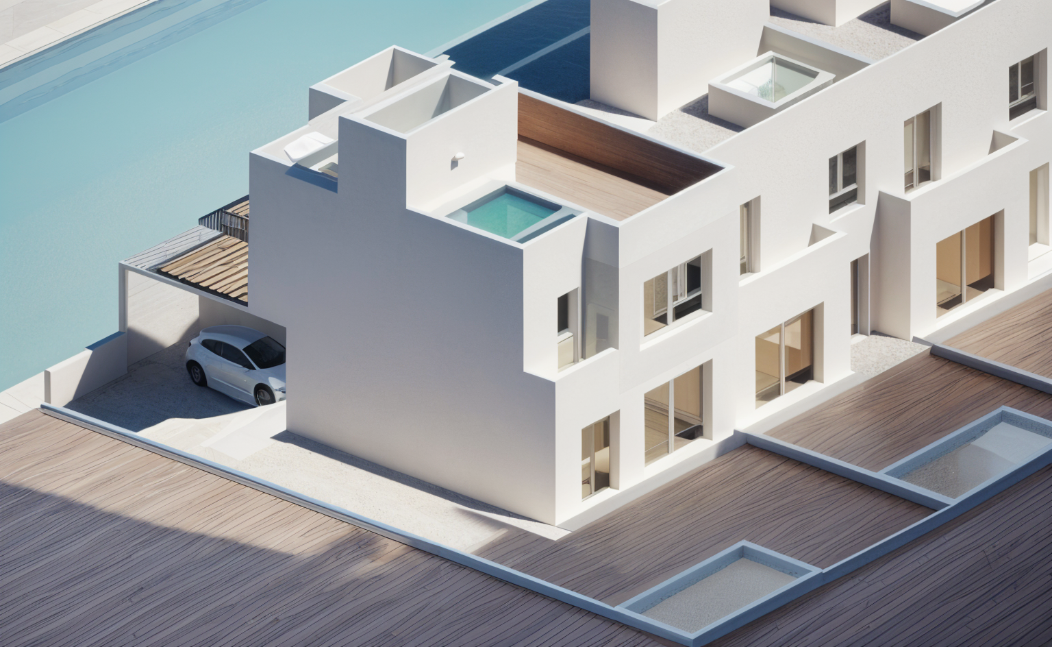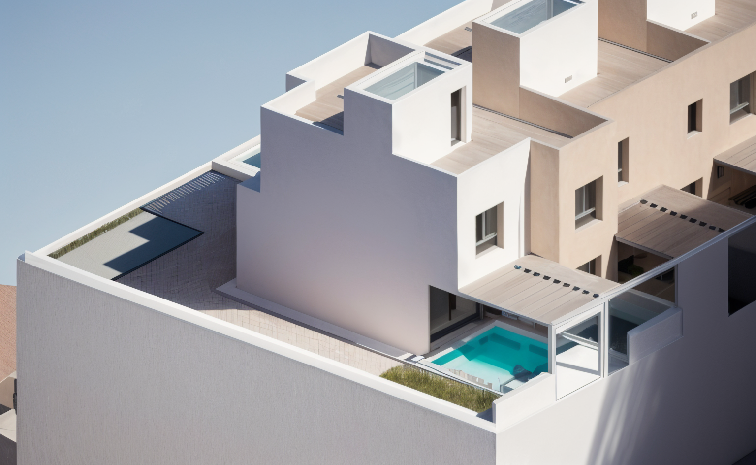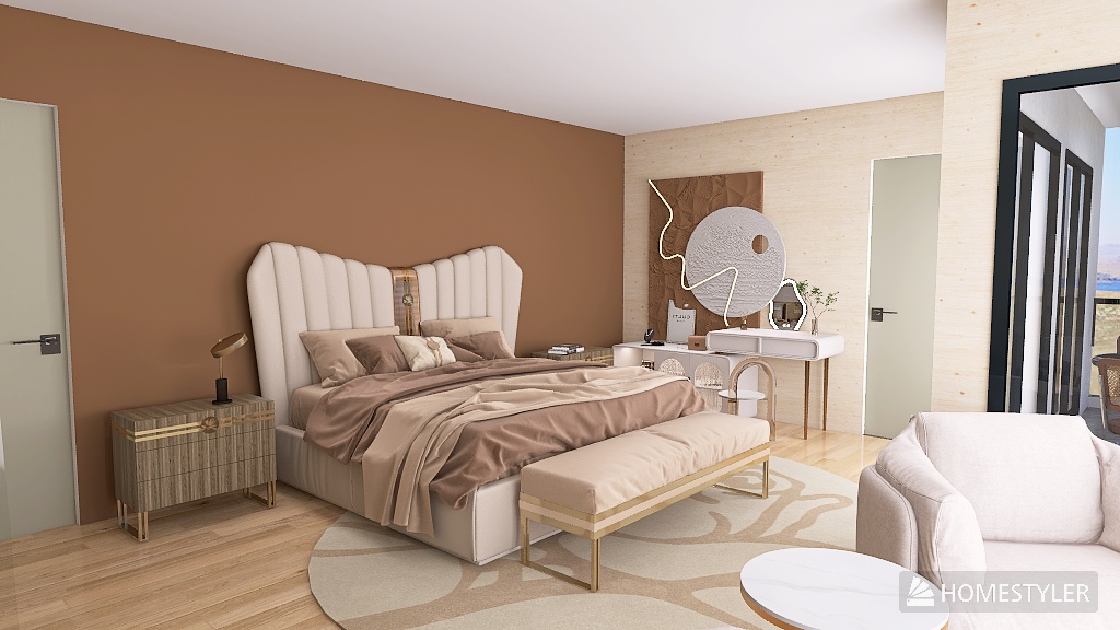 mediterranean revival interior shot render a serene bedroom with minimalist aesthetics the walls are crisp white creating a clean and airy atmosphere a large window frames a peaceful landscape with a clear blue sky and fluffy white clouds the bed is styled with soft grey linens adding a touch of coziness a sleek nightstand with a subtle dark brown surface enhances the elegance while supporting a delicate plant for a touch of nature the wooden floor features a soft natural oak tone grounding the space in warmth capture a soft diffused morning light that illuminates the room creating a harmonious and tranquil environment architecture