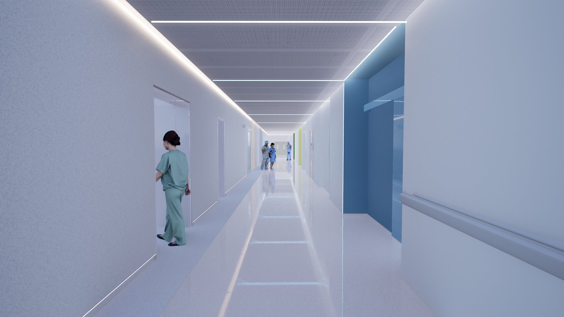 more realism create a bright hallway of an hospital keep the walls white or grey