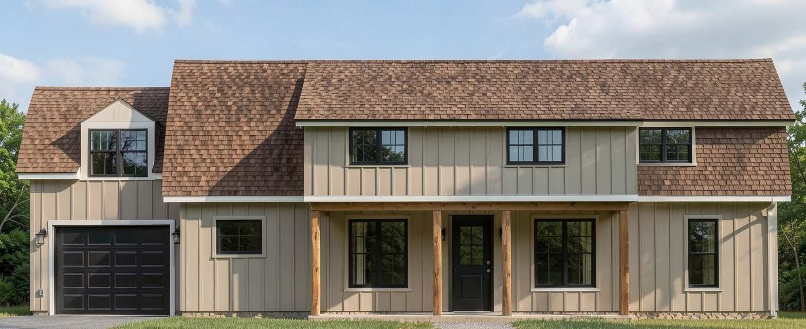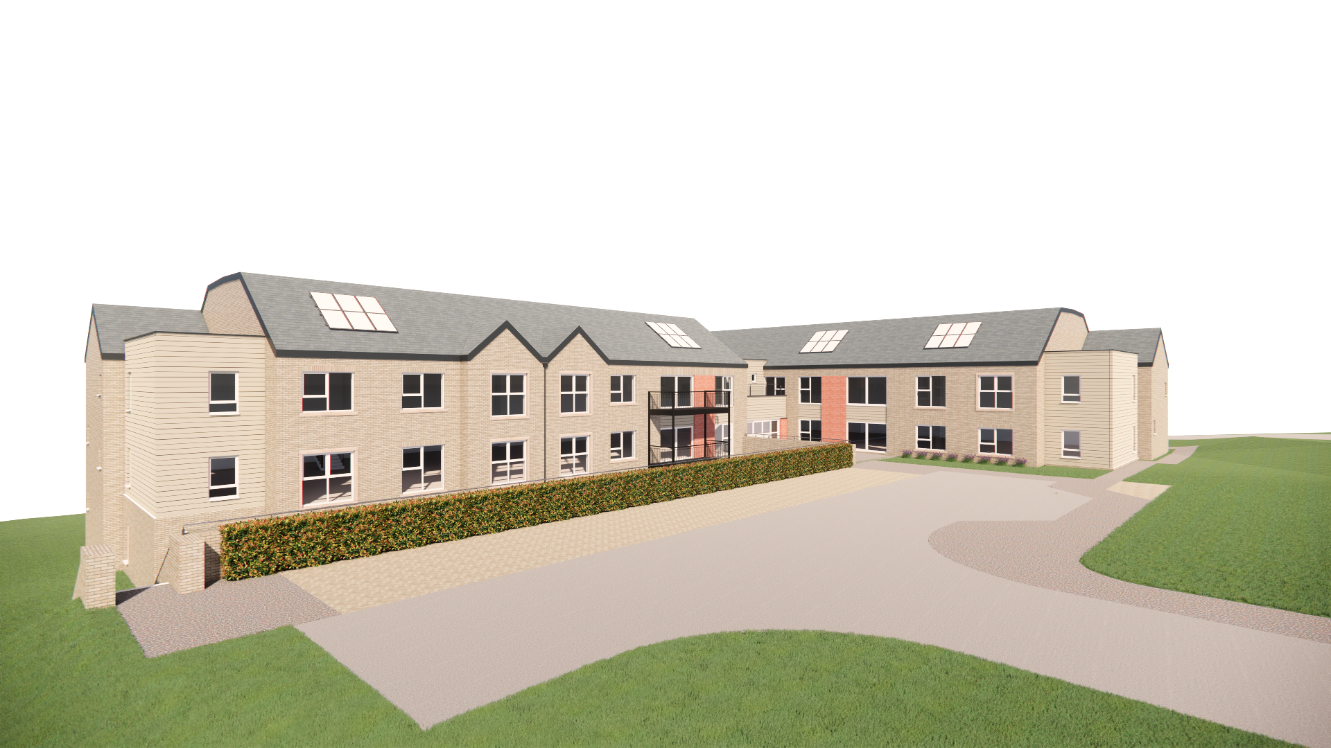 make this render realisitc and enhance it add sky with few clouds add some soft planting on grass areas make grass realistic keep materials the same cream buff common brick where shown horizontal cedral timber effect composite cladding in pebble grey where shown solider cream buff common brick where shown cream sandstone widow cills and surrounds where shown grey modern slate roof tiles brown red common bricks where shown solar panels shown on roof