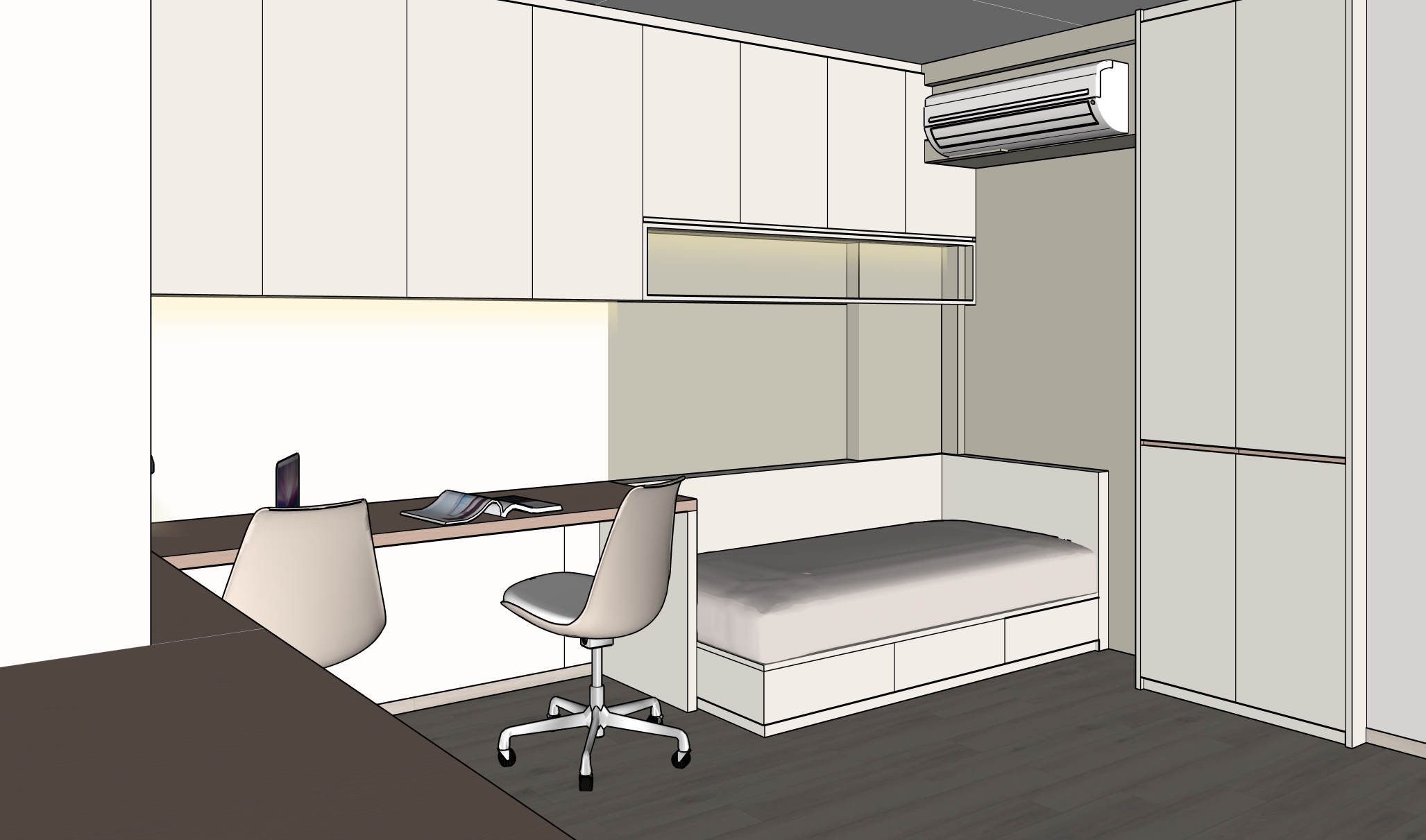 colours to remain accurate as per original given picture wood texture to be subtle 20mm recessed handle at full height cabinet and table surface in muted soft pink subtle wood grains niche in muted ash light green other carpentry in light beige ceilng in off white floor in muted light aircon wall in muted ash light green