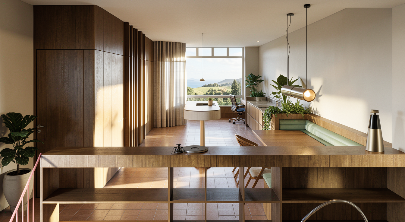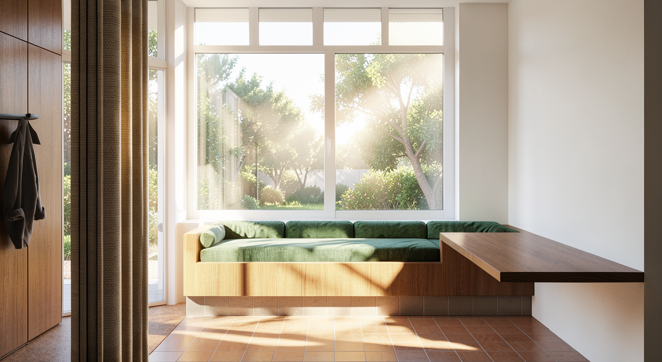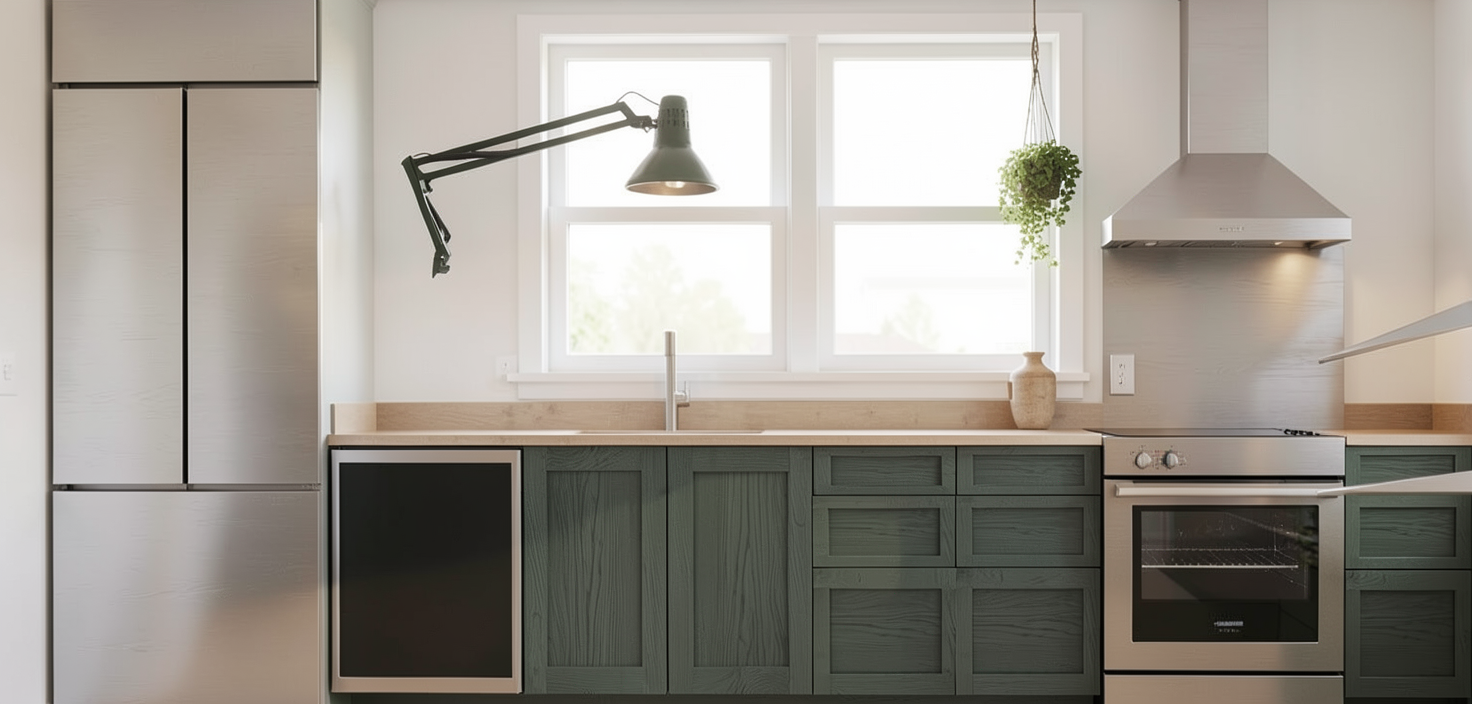 render this dark green stained cabinets with 2 inch circle knobs stainless backsplash and stainless countertop add a some chic wooden bowls with fruit and remove the 2 gray points on the right