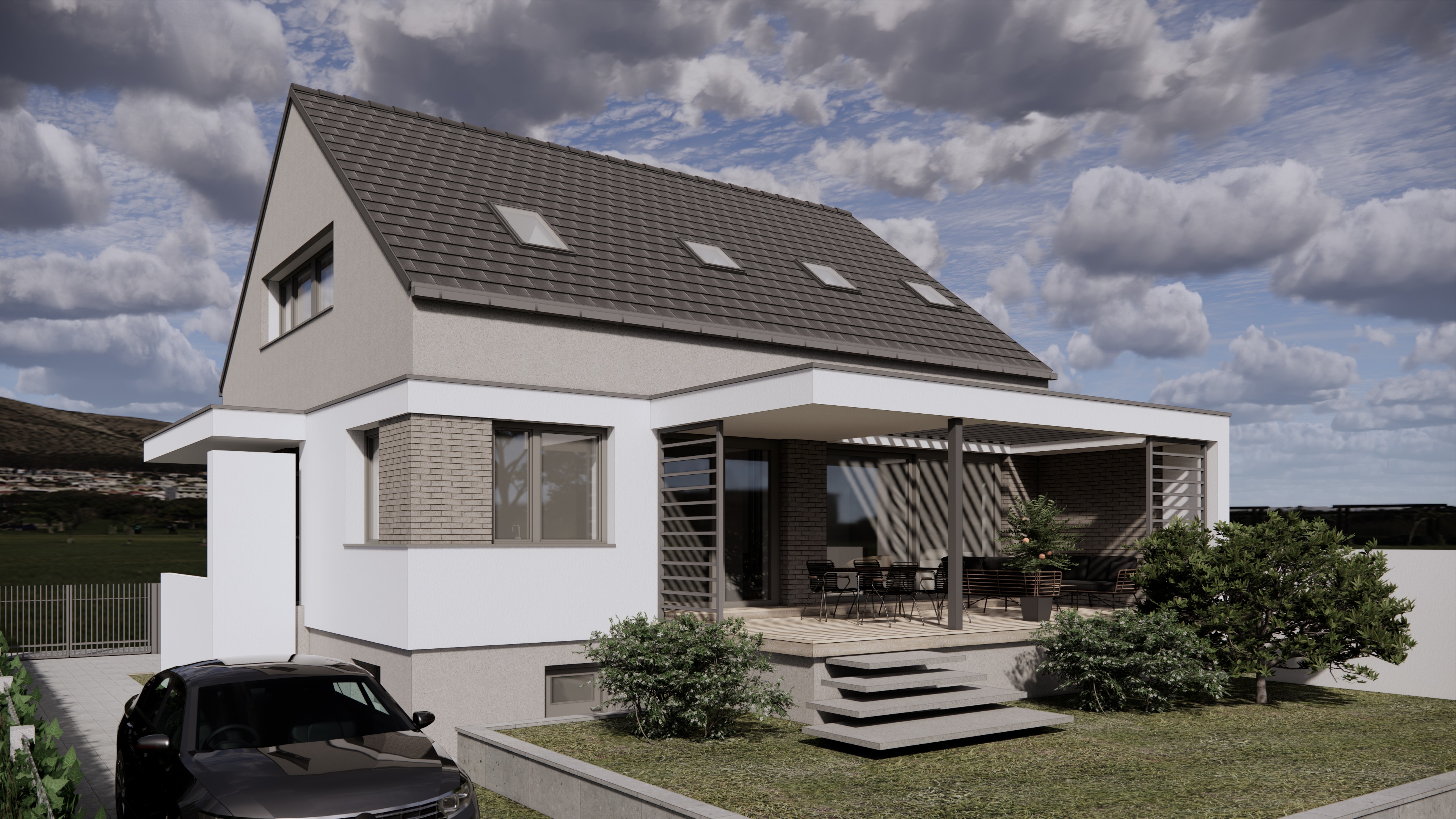 design a modern house with a clean and stylish design the exterior walls are immaculate white and medium grey giving a clean and sharp look the roof is dark charcoal grey creating a striking contrast the terrace cladding is in shades of wood complementing the light warm grey brickwork on the walls the steps leading to the terrace are smooth made of light concrete the atmosphere is peaceful and inviting with soft natural light illuminating the landscape under partly cloudy skies the surrounding greenery is lush and vibrant adding a touch of tranquility and natural beauty to the environment the backdrop should be a small town with several central european plants in the garden