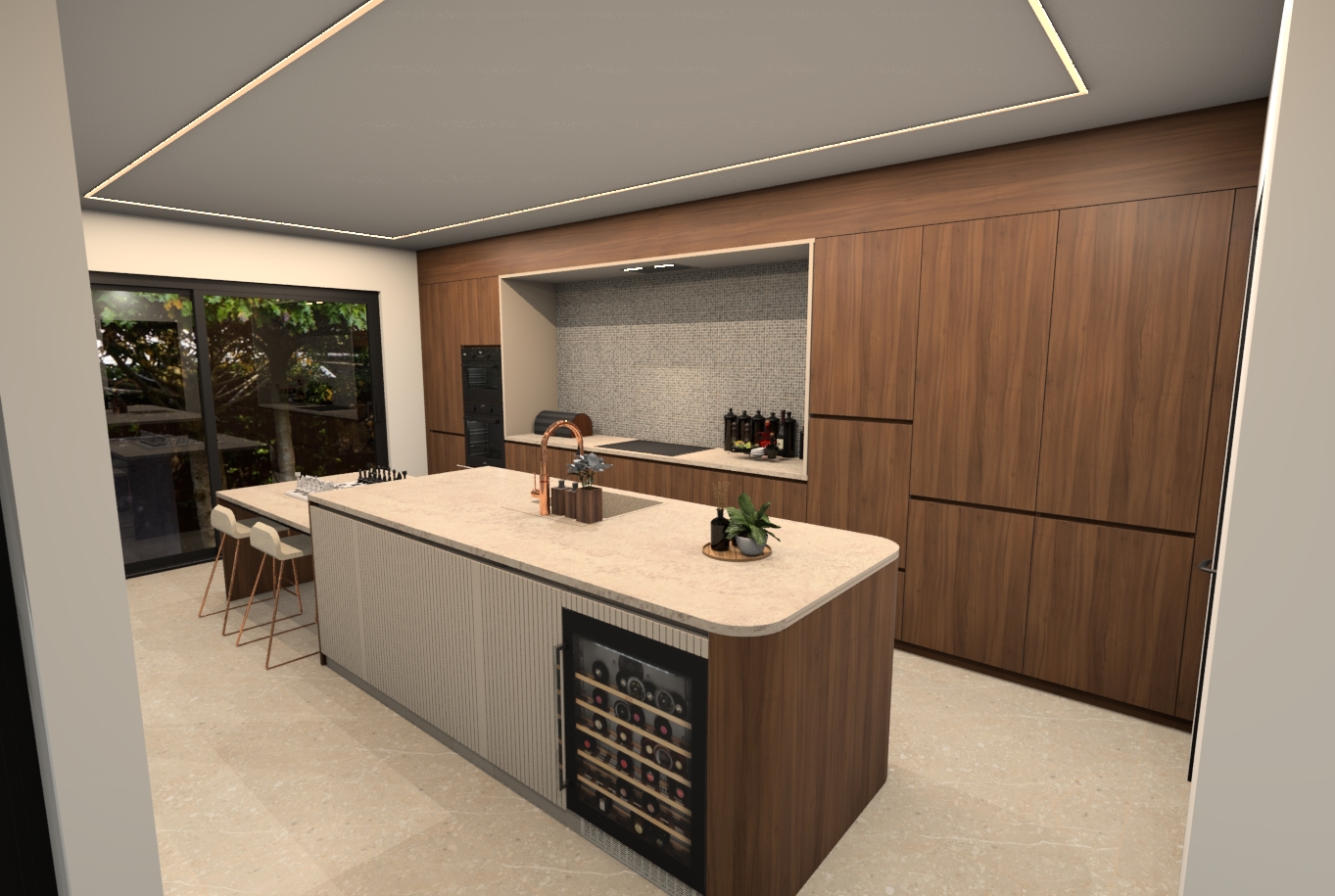 verbeter deze foto van een keuken tot een professionele interieurafbeelding optimaliseer de belichting zodat de ruimte helder natuurlijk en uitnodigend oogt met zachte realistische lichtinval en gebalanceerde schaduwen verhoog de scherpte en helderheid subtiel corrigeer witbalans en kleuren zodat materialen zoals hout steen metaal en lak natuurgetrouw en luxueus overkomen laat het geheel strak stijlvol en hoogwaardig ogen zonder de indeling meubels of architectuur te veranderen behoud een realistische uitstraling verfijn contrast en details verminder ruis en geef de foto een warme elegante interieurstijl zoals in een premium keukencatalogus