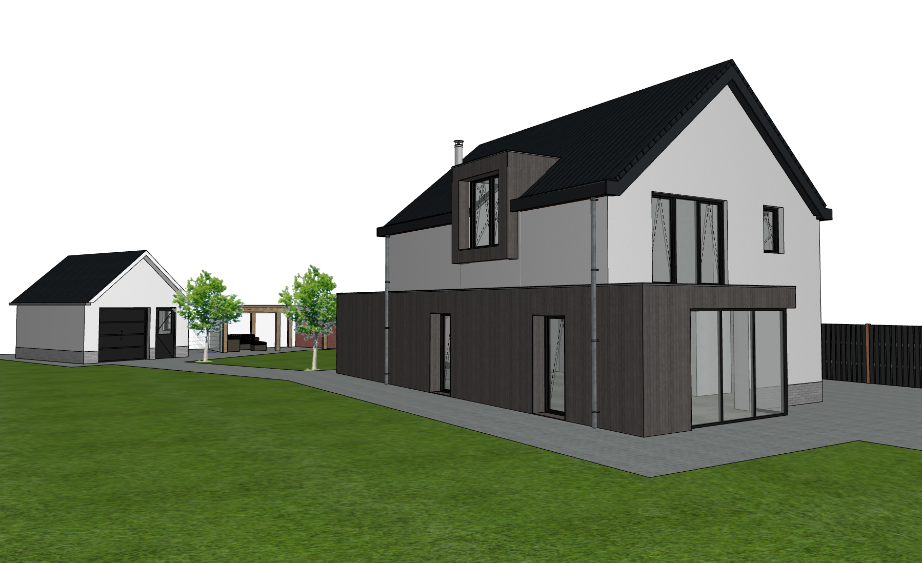modernist exterior shot modernist exterior shot visualize a modern residential building with a contemporary design the building should have wooden exterior walls on the ground floor and the dormer there should be plaster on the first floor large windows with reflective glass and sleek black accents along the edges the atmosphere should be light and airy with clear blue skies and soft sunlight casting soft shadows the surrounding landscape should include lush green grass colorful flowering shrubs and tall deciduous trees with autumn colored leaves architecture architecture