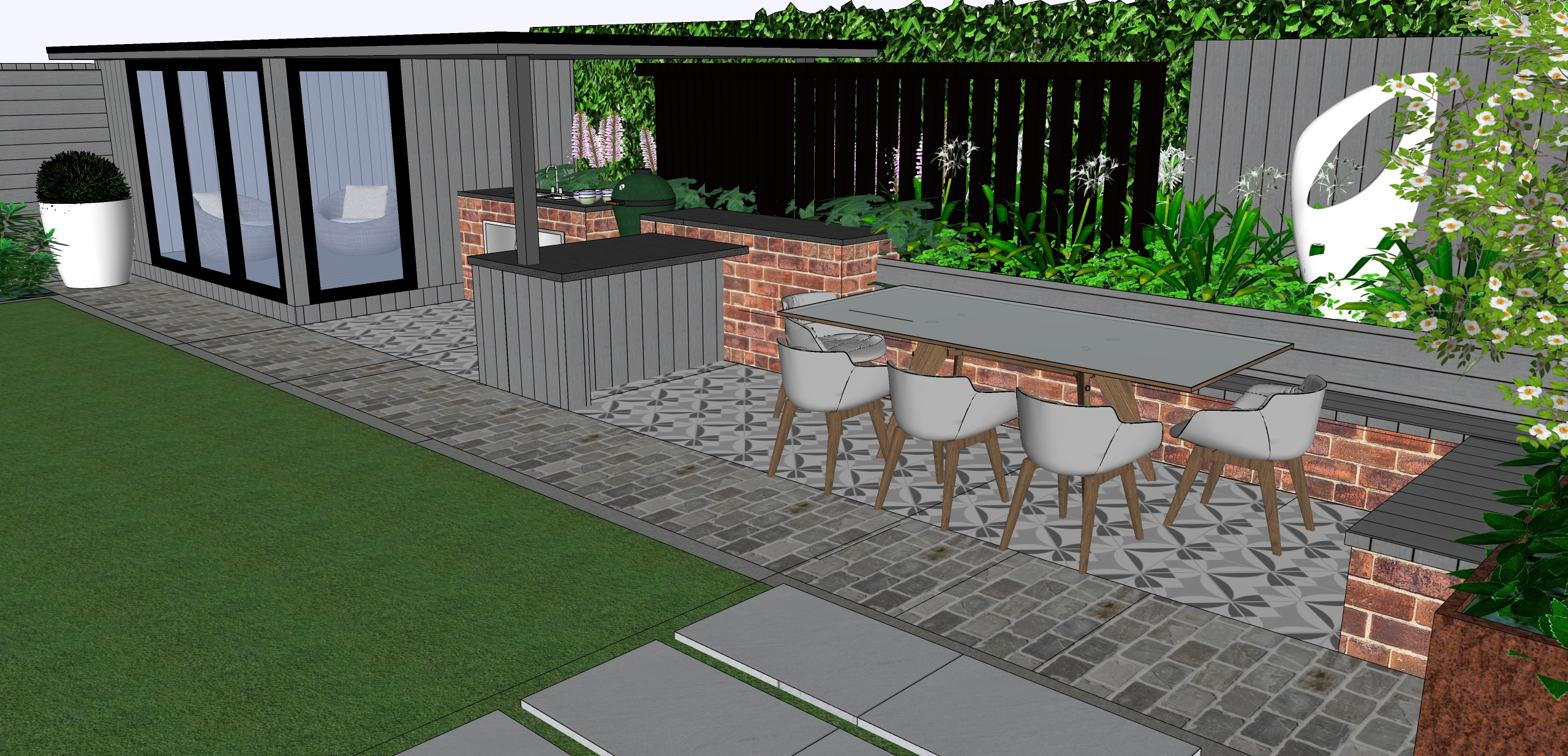 sandstone setts porcelain pattern paving sandstone flags in lawn white sculpture in raised bed seating with brick base and grey timber top and back rest timber fence in the background with large laurel hedge row of black l shape arches outdoor kitchen with outdoor room