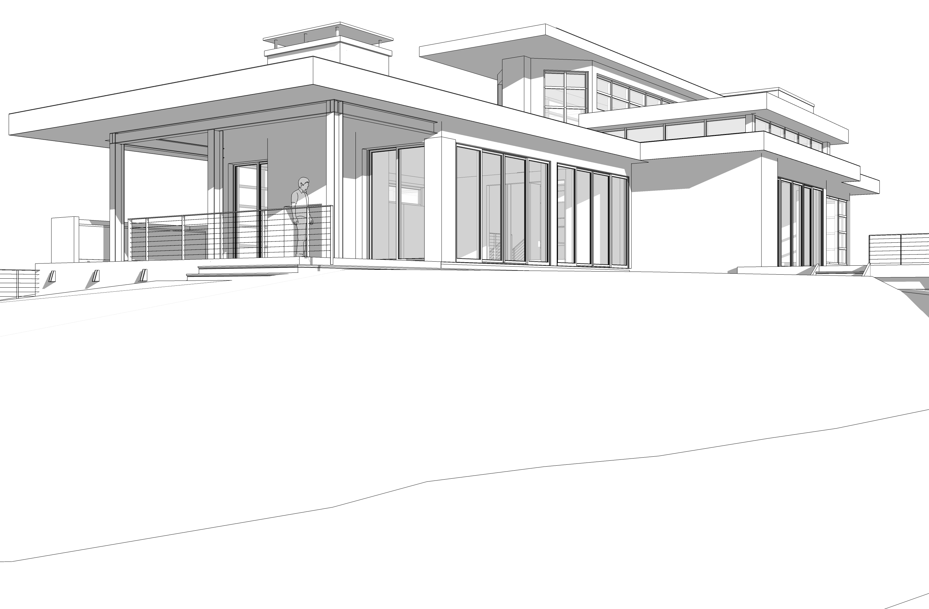 industrial home design matte wood vertical siding black metal panel accent walls matte black fascia stone steps up hill in foreground fog trees in background