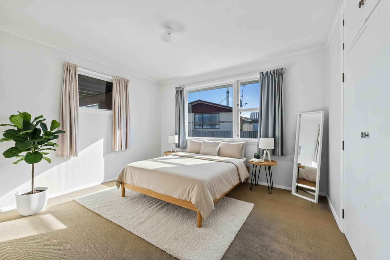 bed under smaller window do not change any features of the room do not remove or change windows or change view out do not change carpet do not change curtains keep room as it is just add furniture no headboard side tables plant in corner no drawers